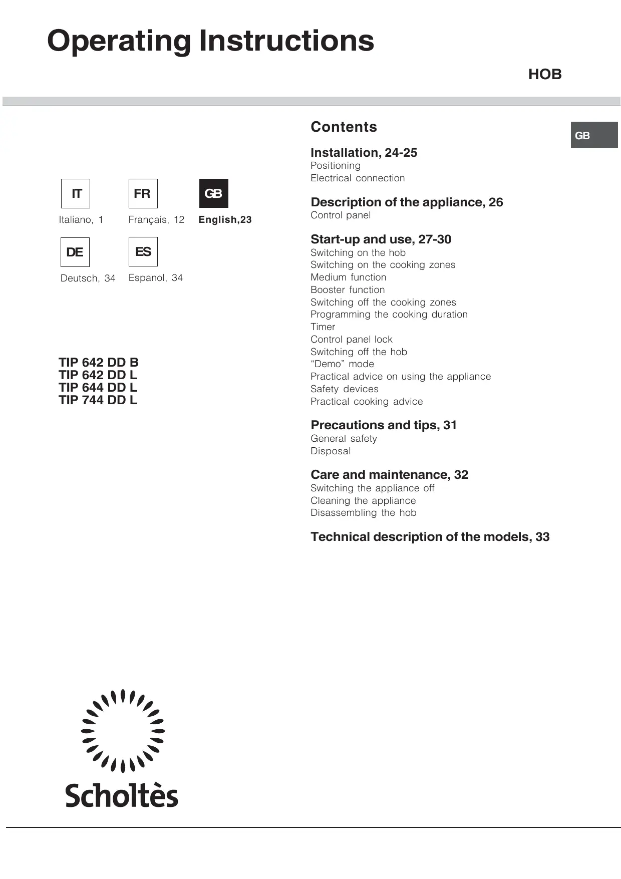 TIP 744 DDL - Hob SCHOLTES - Free user manual and instructions
