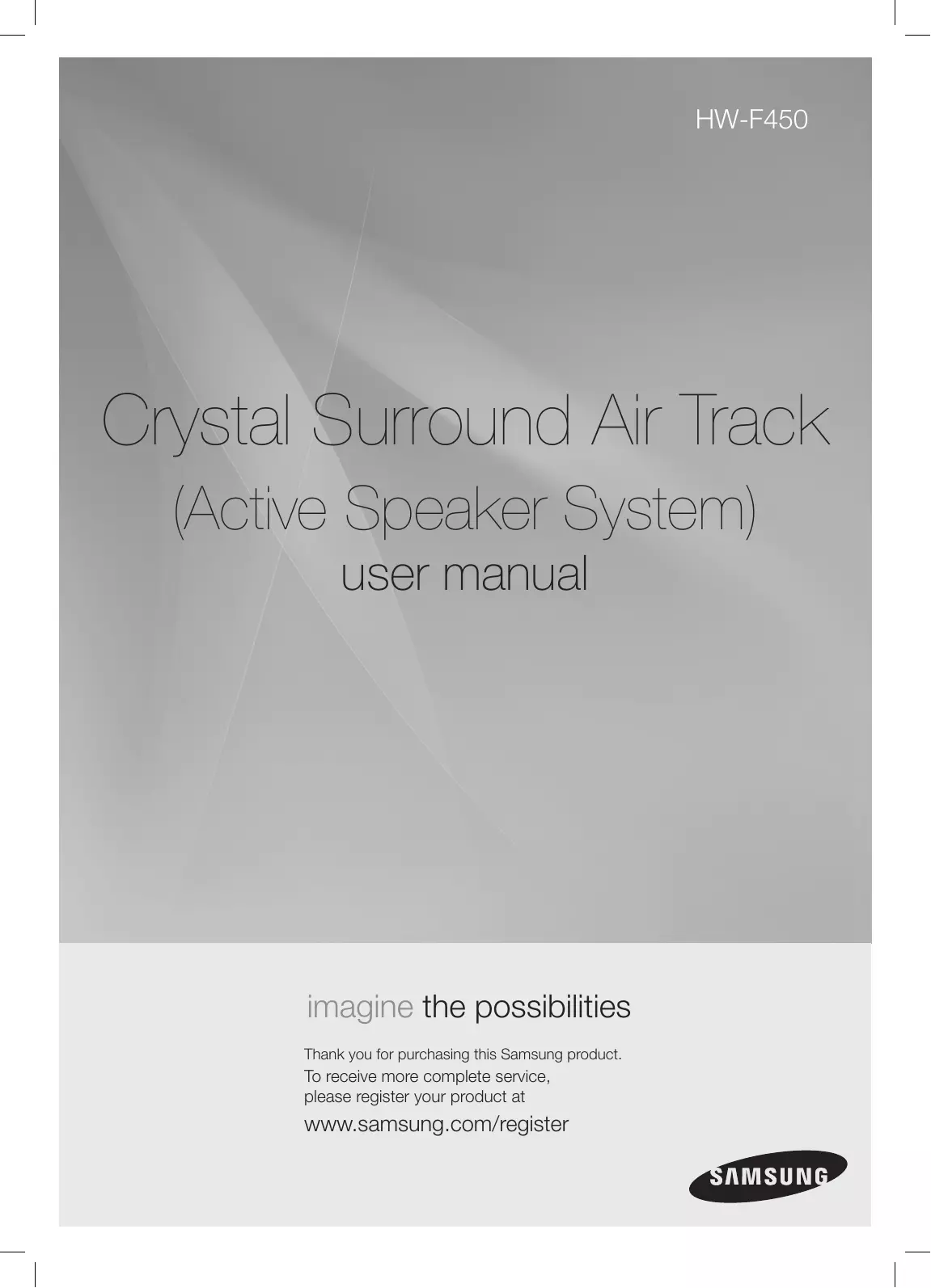 HW-F450 Crystal Surround Air Track (Active Speaker System) user manual imagine the possibilities Thank you for purchasing this Samsung product. To receive more complete service, please register your product at www.samsung.com/register features SoundShare SoundShare produces TV sound on your SAT via a Bluetooth connection and controls the sound. HDMI HDMI transmits video and audio signals simultaneously, and provides a clearer picture. The unit is also equipped with the ARC function which lets you listen to sound from your TV via an HDMI cable through the Crystal Surround Air Track. This function is only available if you connect the unit to an ARC compliant TV.