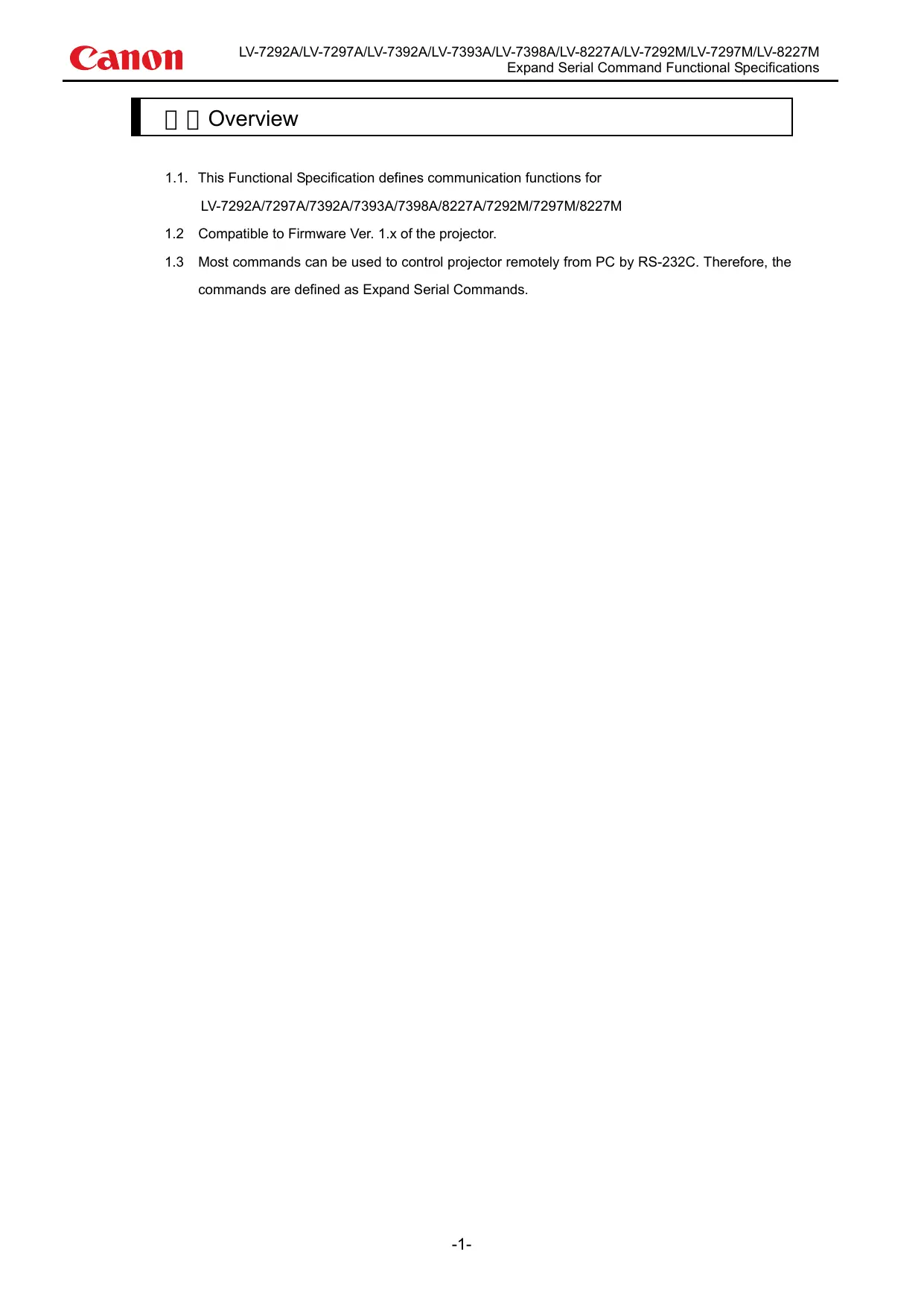 LV-7292A/LV-7297A/LV-7392A/LV-7393A/LV-7398A/LV-8227A/LV-7292M/LV-7297M/LV-8227M Expand Serial Command Functional Specifications 2.Serial Interface Specification