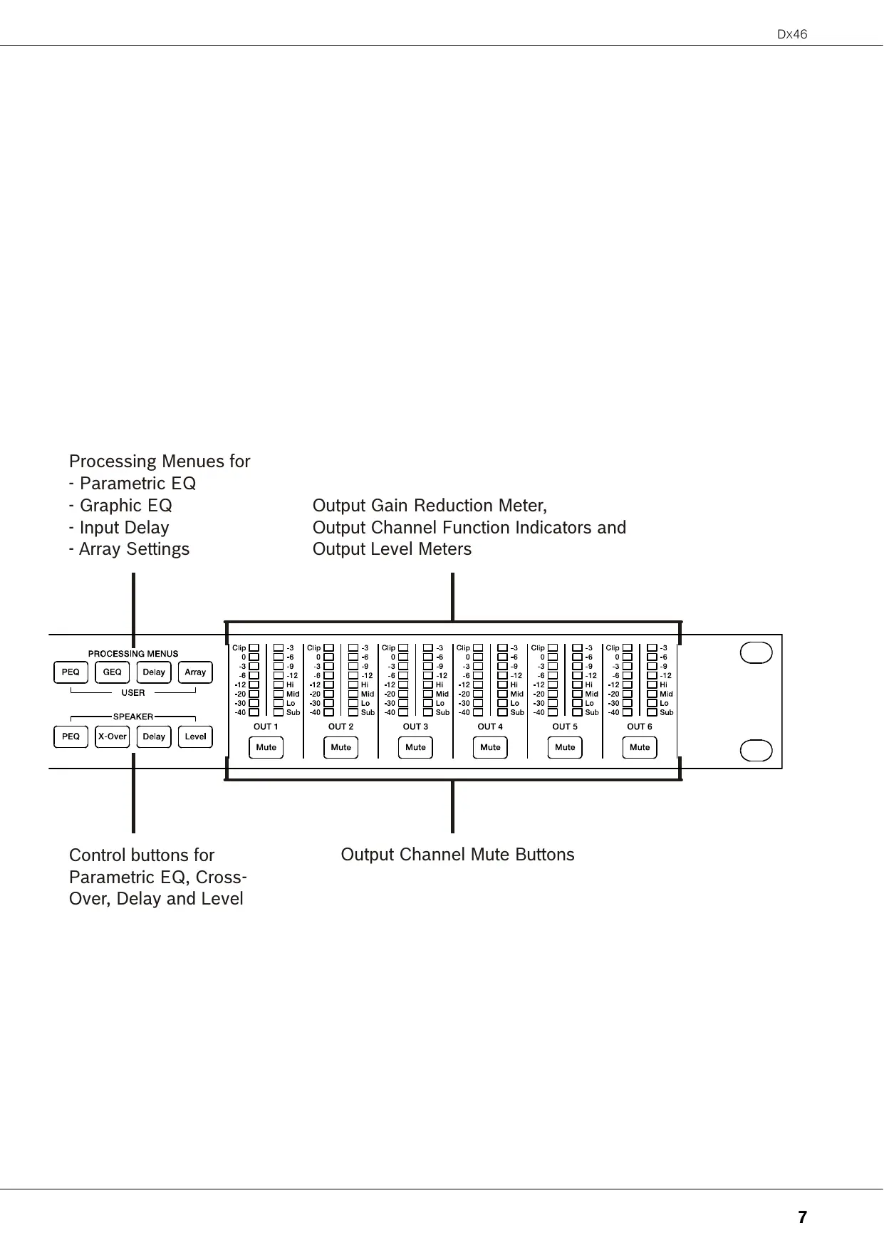 The Dx46 replaces entire racks of signal processors previously needed to properly configure and control sound reinforcement systems with a single Dual-Core DSP processor. The substantial advantages of the Dx46 over discrete signal processing racks include: