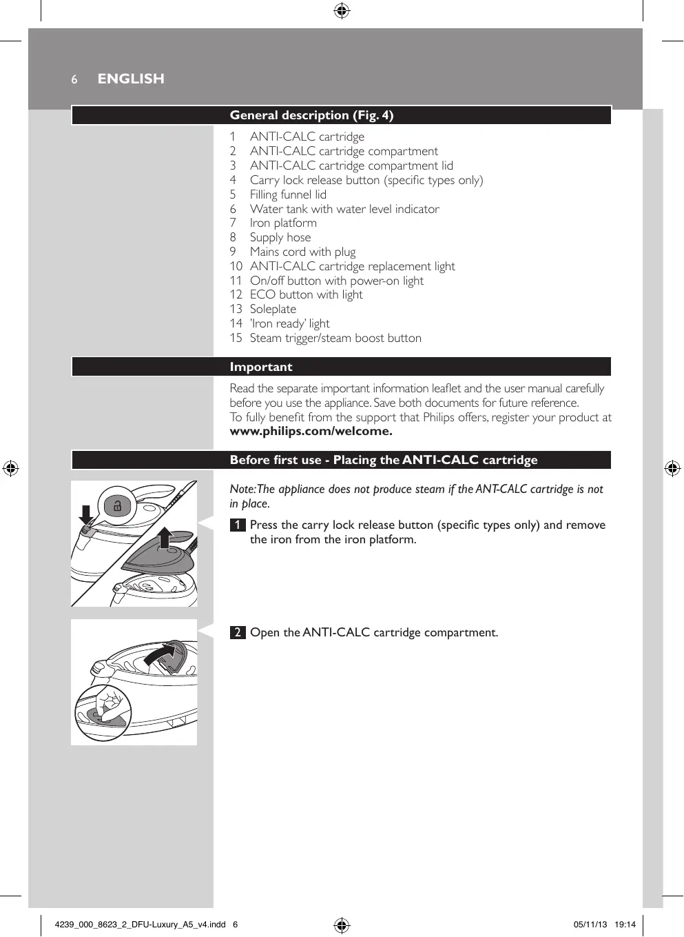 Read the separate important information leaflet and the user manual carefully before you use the appliance. Save both documents for future reference. To fully benefit from the support that Philips offers, register your product at www.philips.com/welcome. Before first use - Placing the ANTI-CALC cartridge Note:The appliance does not produce steam if the ANT-CALC cartridge is not in place. 1 Press the carry lock release button (specific types only) and remove the iron from the iron platform.