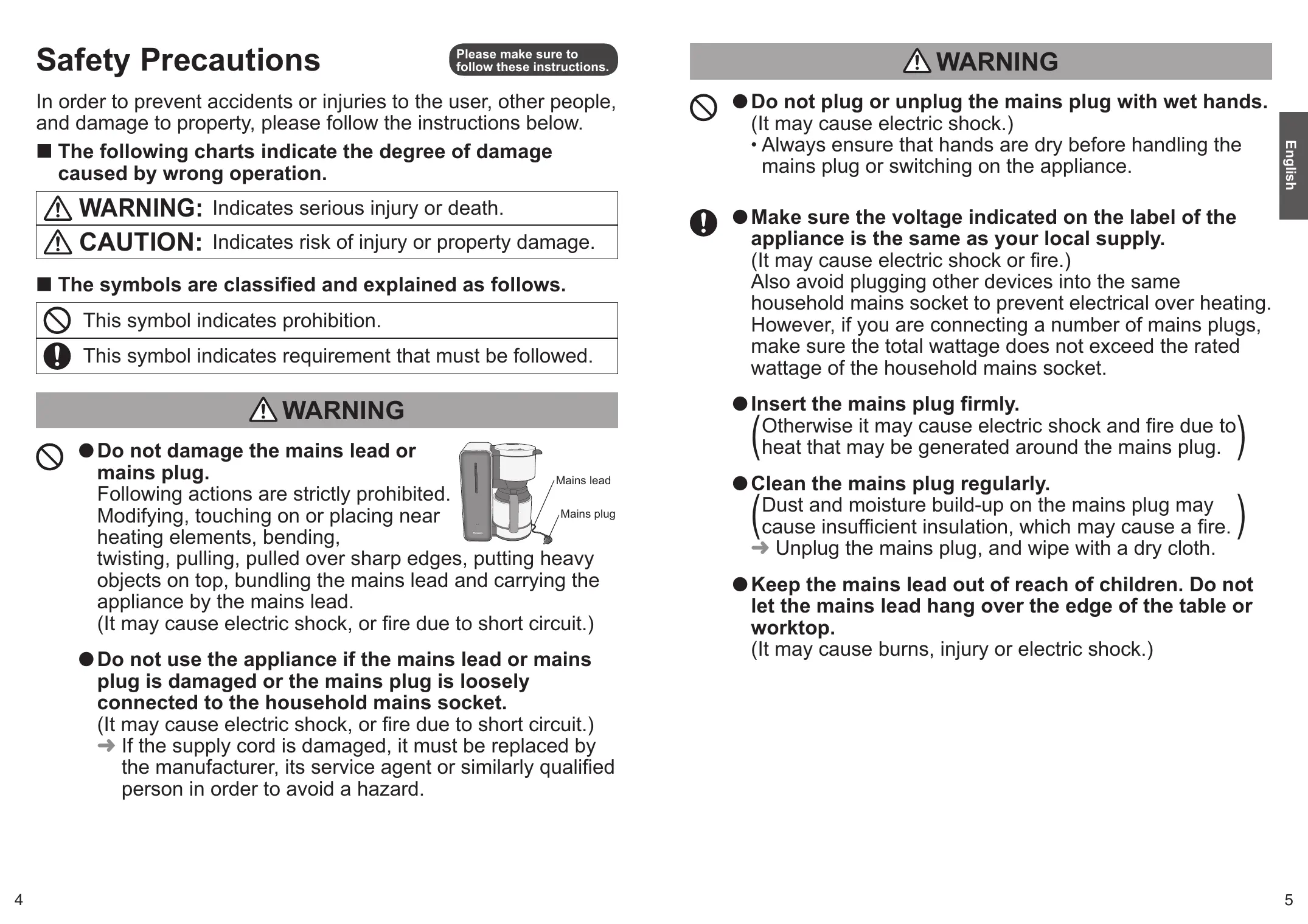 - Do not damage the mains lead or mains plug.