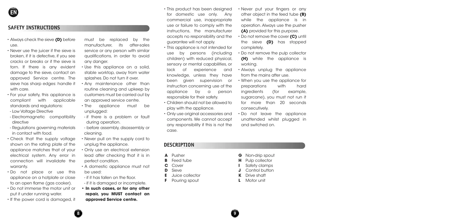 - Clean the motor unit with a damp cloth. PROBLEMS CAUSES The plug is not connected, the switch is not at “1”. Connect the appliance to a socket with the correct voltage. Operate the appliance. The cover (C) is not properly clamped. Check that the cover (C) is properly fitted and clamped. The sieve (D) is not properly fitted. Check that the sieve (D) is fitted properly. The quantity of food being processed is too great. Leave the appliance to cool and reduce the quantity to be processed. The appliance does not work. The appliance is giving off a smell or is very hot to the touch or is smoking or making an abnormal noise. The juice does not flow correctly. SOLUTIONS Check that the juice The juice collector (E) is collector (E) is fitted not fitted properly. correctly. The sieve (D) is blocked. Clean the sieve (D). If you have any other problem or query please contact the Helpline at the end of this leaflet.