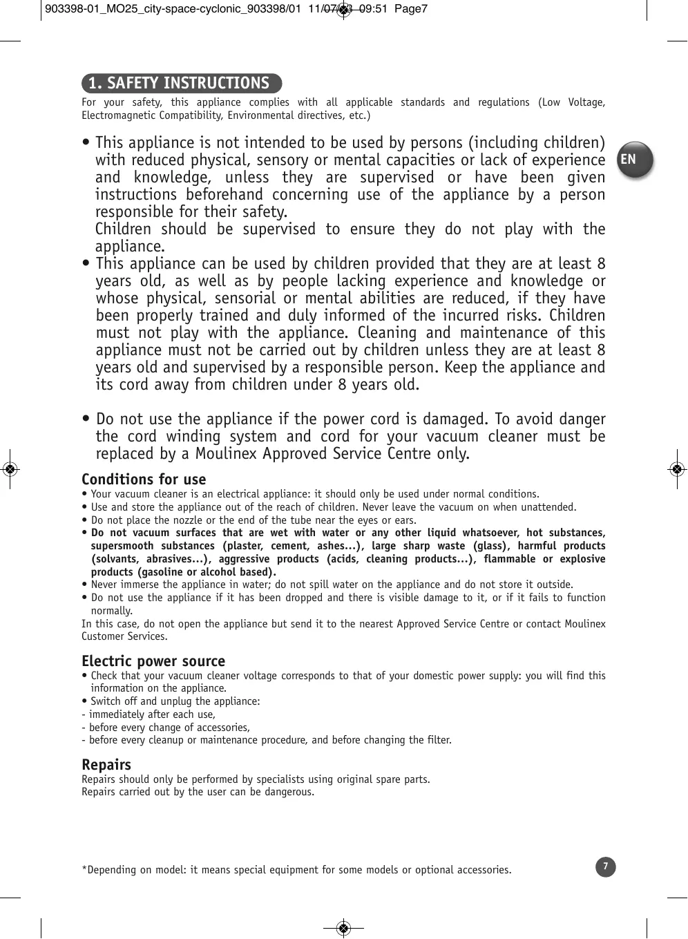 - Do not use the appliance if the power cord is damaged. To avoid danger the cord winding system and cord for your vacuum cleaner must be replaced by a Moulinex Approved Service Centre only. Conditions for use