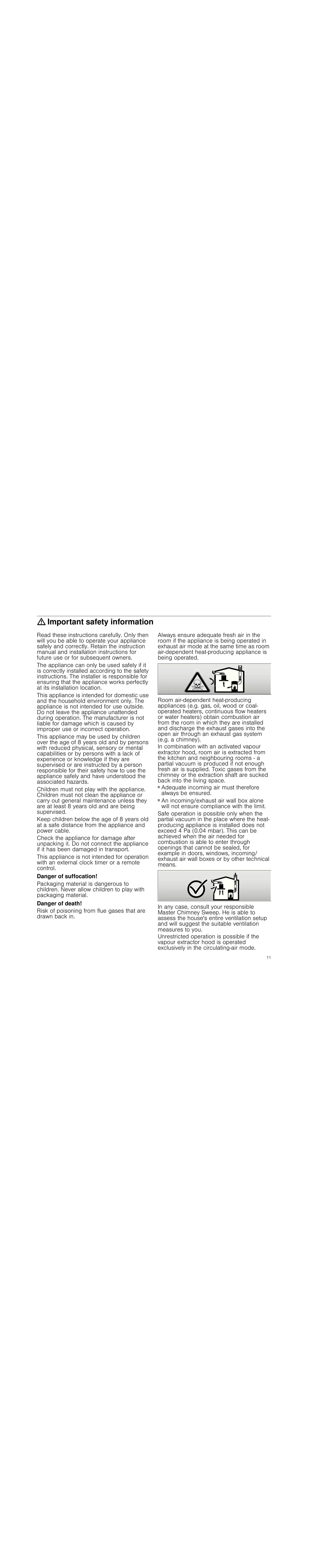 Read these instructions carefully. Only then will you be able to operate your appliance safely and correctly. Retain the instruction manual and installation instructions for future use or for subsequent owners. The appliance can only be used safely if it is correctly installed according to the safety instructions. The installer is responsible for ensuring that the appliance works perfectly at its installation location. This appliance is intended for domestic use and the household environment only. The appliance is not intended for use outside. Do not leave the appliance unattended during operation. The manufacturer is not liable for damage which is caused by improper use or incorrect operation. This appliance may be used by children over the age of 8 years old and by persons with reduced physical, sensory or mental capabilities or by persons with a lack of experience or knowledge if they are supervised or are instructed by a person responsible for their safety how to use the appliance safely and have understood the associated hazards. Children must not play with the appliance. Children must not clean the appliance or carry out general maintenance unless they are at least 8 years old and are being supervised. Keep children below the age of 8 years old at a safe distance from the appliance and power cable. Check the appliance for damage after unpacking it. Do not connect the appliance if it has been damaged in transport. This appliance is not intended for operation with an external clock timer or a remote control. Danger of suffocation! Packaging material is dangerous to children. Never allow children to play with packaging material. Danger of death! Risk of poisoning from flue gases that are drawn back in.