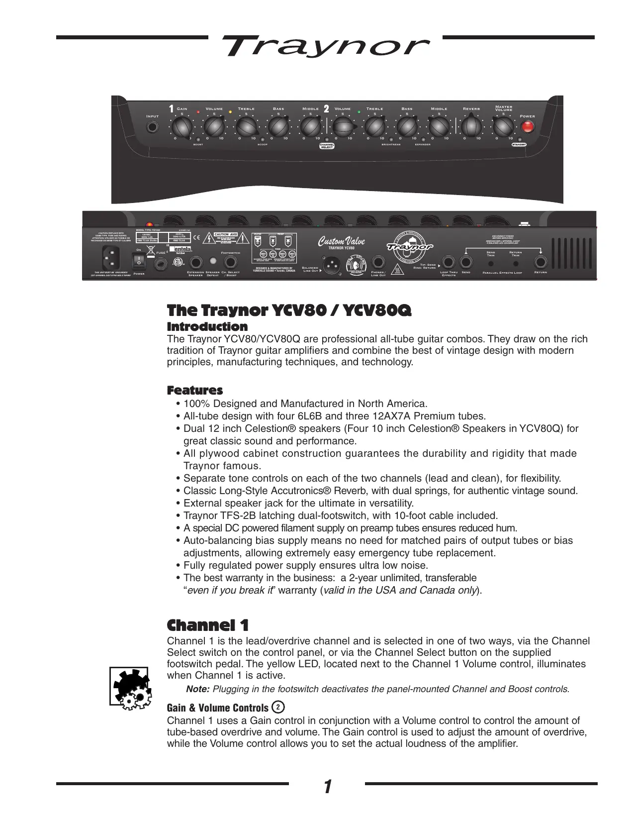- The best warranty in the business: a 2-year unlimited, transferable “even if you break it” warranty (valid in the USA and Canada only). Channel 1 Channel 1 is the lead/overdrive channel and is selected in one of two ways, via the Channel Select switch on the control panel, or via the Channel Select button on the supplied footswitch pedal. The yellow LED, located next to the Channel 1 Volume control, illuminates when Channel 1 is active. Note: Plugging in the footswitch deactivates the panel-mounted Channel and Boost controls. Gain & Volume Controls 2 Channel 1 uses a Gain control in conjunction with a Volume control to control the amount of tube-based overdrive and volume. The Gain control is used to adjust the amount of overdrive, while the Volume control allows you to set the actual loudness of the amplifier.
