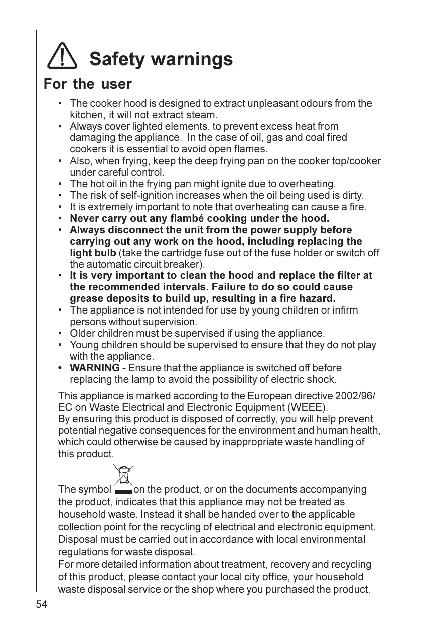 Safety warnings For the user The cooker hood is designed to extract unpleasant odours from the kitchen, it will not extract steam. Always cover lighted elements, to prevent excess heat from damaging the appliance. In the case of oil, gas and coal fired cookers it is essential to avoid open flames. Also, when frying, keep the deep frying pan on the cooker top/cooker under careful control. The hot oil in the frying pan might ignite due to overheating. The risk of self-ignition increases when the oil being used is dirty. It is extremely important to note that overheating can cause a fire. Never carry out any flambé cooking under the hood. Always disconnect the unit from the power supply before carrying out any work on the hood, including replacing the light bulb (take the cartridge fuse out of the fuse holder or switch off the automatic circuit breaker). It is very important to clean the hood and replace the filter at the recommended intervals. Failure to do so could cause grease deposits to build up, resulting in a fire hazard. The appliance is not intended for use by young children or infirm persons without supervision. Older children must be supervised if using the appliance. Young children should be supervised to ensure that they do not play with the appliance. WARNING - Ensure that the appliance is switched off before replacing the lamp to avoid the possibility of electric shock. This appliance is marked according to the European directive 2002/96/ EC on Waste Electrical and Electronic Equipment (WEEE). By ensuring this product is disposed of correctly, you will help prevent potential negative consequences for the environment and human health, which could otherwise be caused by inappropriate waste handling of this product. The symbol on the product, or on the documents accompanying the product, indicates that this appliance may not be treated as household waste. Instead it shall be handed over to the applicable collection point for the recycling of electrical and electronic equipment. Disposal must be carried out in accordance with local environmental regulations for waste disposal. For more detailed information about treatment, recovery and recycling of this product, please contact your local city office, your household waste disposal service or the shop where you purchased the product.