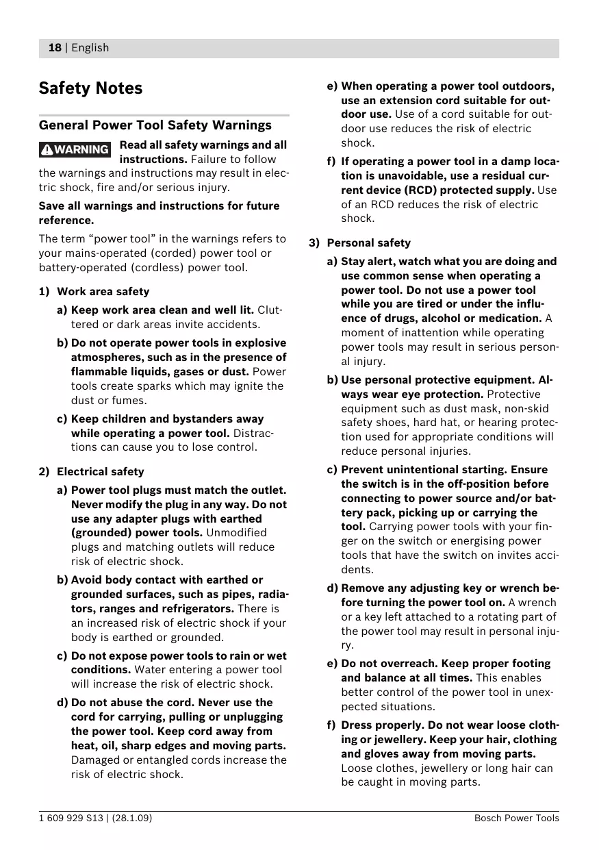 Bosch Power Tools Bosch Power Tools Bosch Power Tools Bosch Power Tools Bosch Power Tools Bosch Power Tools Dr. Eckerhard Strötgen Head of Product Certification Bosch Power Tools Bosch Power Tools Bosch Power Tools Bosch Power Tools Deutsch | 17 Bosch Power Tools 1 609 929 S13 | (28.1.09) 18 | English General Power Tool Safety Warnings WARNING Read all safety warnings and all instructions. Failure to follow the warnings and instructions may result in electric shock, fire and/or serious injury. Save all warnings and instructions for future reference. The term “power tool” in the warnings refers to your mains-operated (corded) power tool or battery-operated (cordless) power tool.