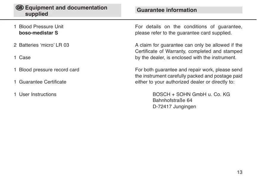 Systole mmHg Diastole mmHg Puls/min Equipment and documentation supplied Guarantee information 1 Blood Pressure Unit boso-medistar S For details on the conditions of guarantee, please refer to the guarantee card supplied. 2 Batteries ‘micro’ LR 03 A claim for guarantee can only be allowed if the Certificate of Warranty, completed and stamped by the dealer, is enclosed with the instrument. 1 Case 1 Blood pressure record card 1 Guarantee Certificate 1 User Instructions For both guarantee and repair work, please send the instrument carefully packed and postage paid either to your authorized dealer or directly to: BOSCH + SOHN GmbH u. Co. KG Bahnhofstraße 64 D-72417 Jungingen