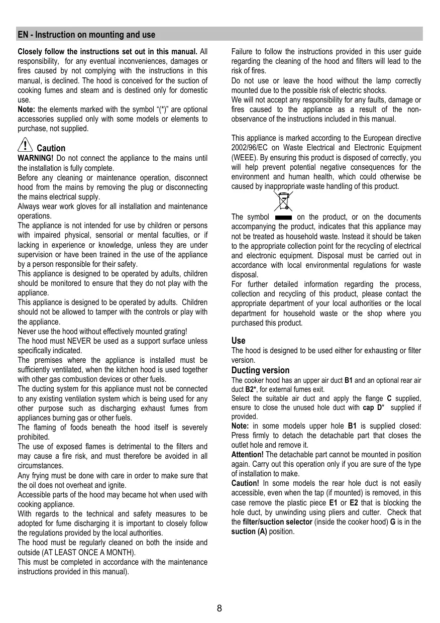 EN - Instruction on mounting and use Closely follow the instructions set out in this manual. All responsibility, for any eventual inconveniences, damages or fires caused by not complying with the instructions in this manual, is declined. The hood is conceived for the suction of cooking fumes and steam and is destined only for domestic use. Note: the elements marked with the symbol “(*)” are optional accessories supplied only with some models or elements to purchase, not supplied. Failure to follow the instructions provided in this user guide regarding the cleaning of the hood and filters will lead to the risk of fires. Do not use or leave the hood without the lamp correctly mounted due to the possible risk of electric shocks. We will not accept any responsibility for any faults, damage or fires caused to the appliance as a result of the nonobservance of the instructions included in this manual. This appliance is marked according to the European directive 2002/96/EC on Waste Electrical and Electronic Equipment (WEEE). By ensuring this product is disposed of correctly, you will help prevent potential negative consequences for the environment and human health, which could otherwise be caused by inappropriate waste handling of this product. Caution WARNING! Do not connect the appliance to the mains until the installation is fully complete. Before any cleaning or maintenance operation, disconnect hood from the mains by removing the plug or disconnecting the mains electrical supply. Always wear work gloves for all installation and maintenance operations. The appliance is not intended for use by children or persons with impaired physical, sensorial or mental faculties, or if lacking in experience or knowledge, unless they are under supervision or have been trained in the use of the appliance by a person responsible for their safety. This appliance is designed to be operated by adults, children should be monitored to ensure that they do not play with the appliance. This appliance is designed to be operated by adults. Children should not be allowed to tamper with the controls or play with the appliance. Never use the hood without effectively mounted grating! The hood must NEVER be used as a support surface unless specifically indicated. The premises where the appliance is installed must be sufficiently ventilated, when the kitchen hood is used together with other gas combustion devices or other fuels. The ducting system for this appliance must not be connected to any existing ventilation system which is being used for any other purpose such as discharging exhaust fumes from appliances burning gas or other fuels. The flaming of foods beneath the hood itself is severely prohibited. The use of exposed flames is detrimental to the filters and may cause a fire risk, and must therefore be avoided in all circumstances. Any frying must be done with care in order to make sure that the oil does not overheat and ignite. Accessible parts of the hood may became hot when used with cooking appliance. With regards to the technical and safety measures to be adopted for fume discharging it is important to closely follow the regulations provided by the local authorities. The hood must be regularly cleaned on both the inside and outside (AT LEAST ONCE A MONTH). This must be completed in accordance with the maintenance instructions provided in this manual). on the product, or on the documents The symbol accompanying the product, indicates that this appliance may not be treated as household waste. Instead it should be taken to the appropriate collection point for the recycling of electrical and electronic equipment. Disposal must be carried out in accordance with local environmental regulations for waste disposal. For further detailed information regarding the process, collection and recycling of this product, please contact the appropriate department of your local authorities or the local department for household waste or the shop where you purchased this product. Use The hood is designed to be used either for exhausting or filter version. Ducting version The cooker hood has an upper air duct B1 and an optional rear air duct B2*, for external fumes exit. Select the suitable air duct and apply the flange C supplied, ensure to close the unused hole duct with cap D* supplied if provided. Note: in some models upper hole B1 is supplied closed: Press firmly to detach the detachable part that closes the outlet hole and remove it. Attention! The detachable part cannot be mounted in position again. Carry out this operation only if you are sure of the type of installation to make. Caution! In some models the rear hole duct is not easily accessible, even when the tap (if mounted) is removed, in this case remove the plastic piece E1 or E2 that is blocking the hole duct, by unwinding using pliers and cutter. Check that the filter/suction selector (inside the cooker hood) G is in the suction (A) position.