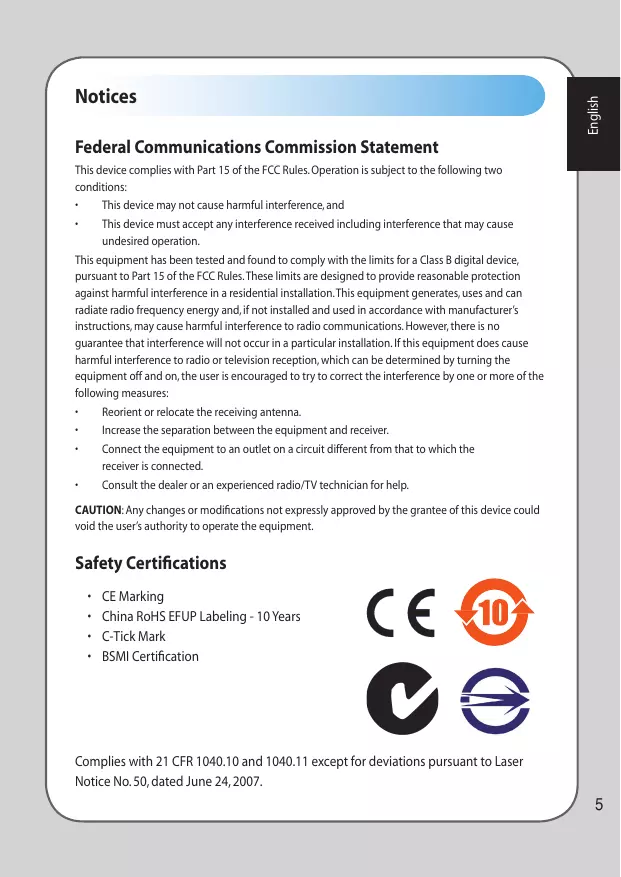 本 語 Complies with 21 CFR 1040.10 and 1040.11 except for deviations pursuant to Laser Notice No. 50, dated June 24, 2007.