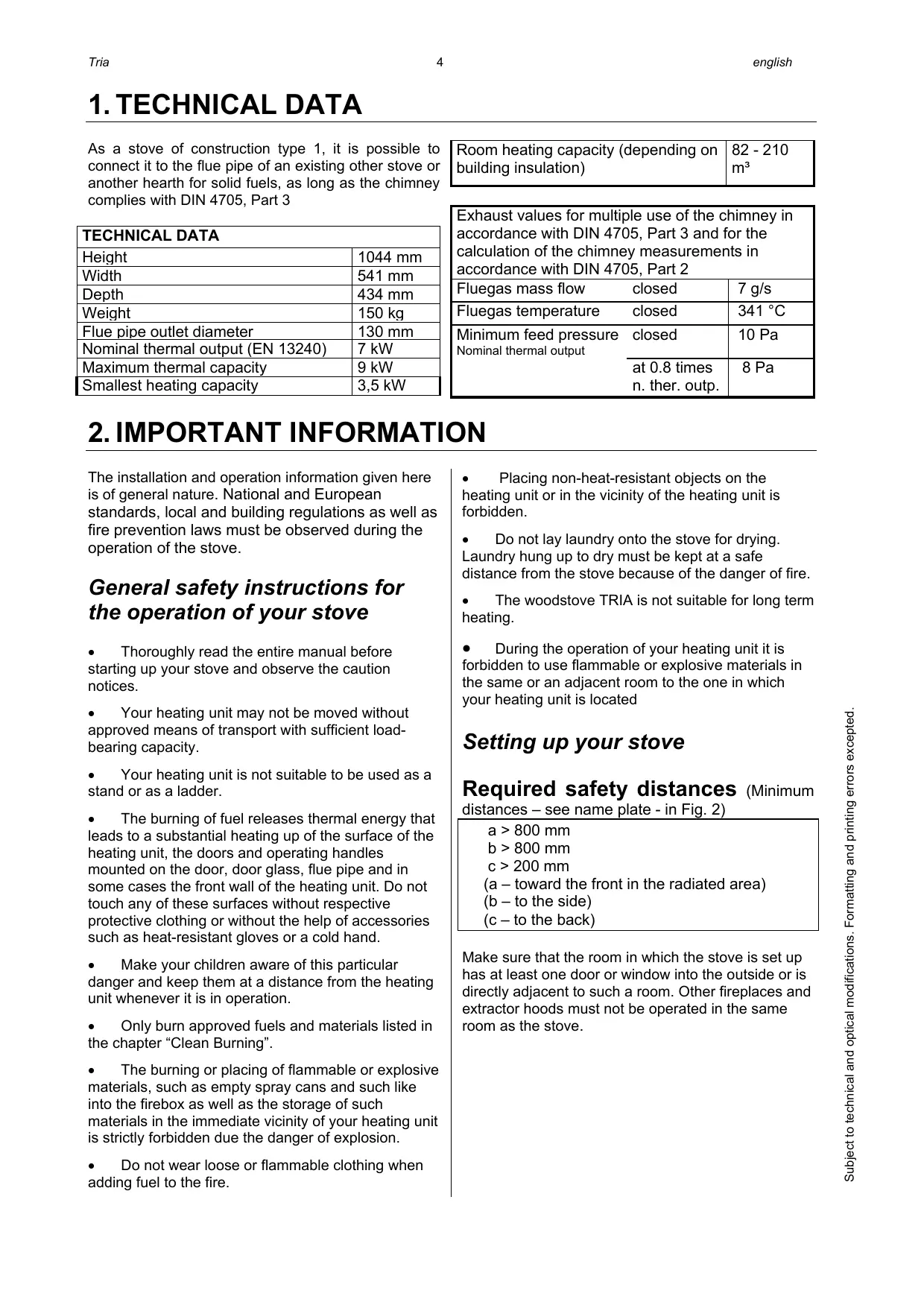 The installation and operation information given here is of general nature. National and European standards, local and building regulations as well as fire prevention laws must be observed during the operation of the stove.