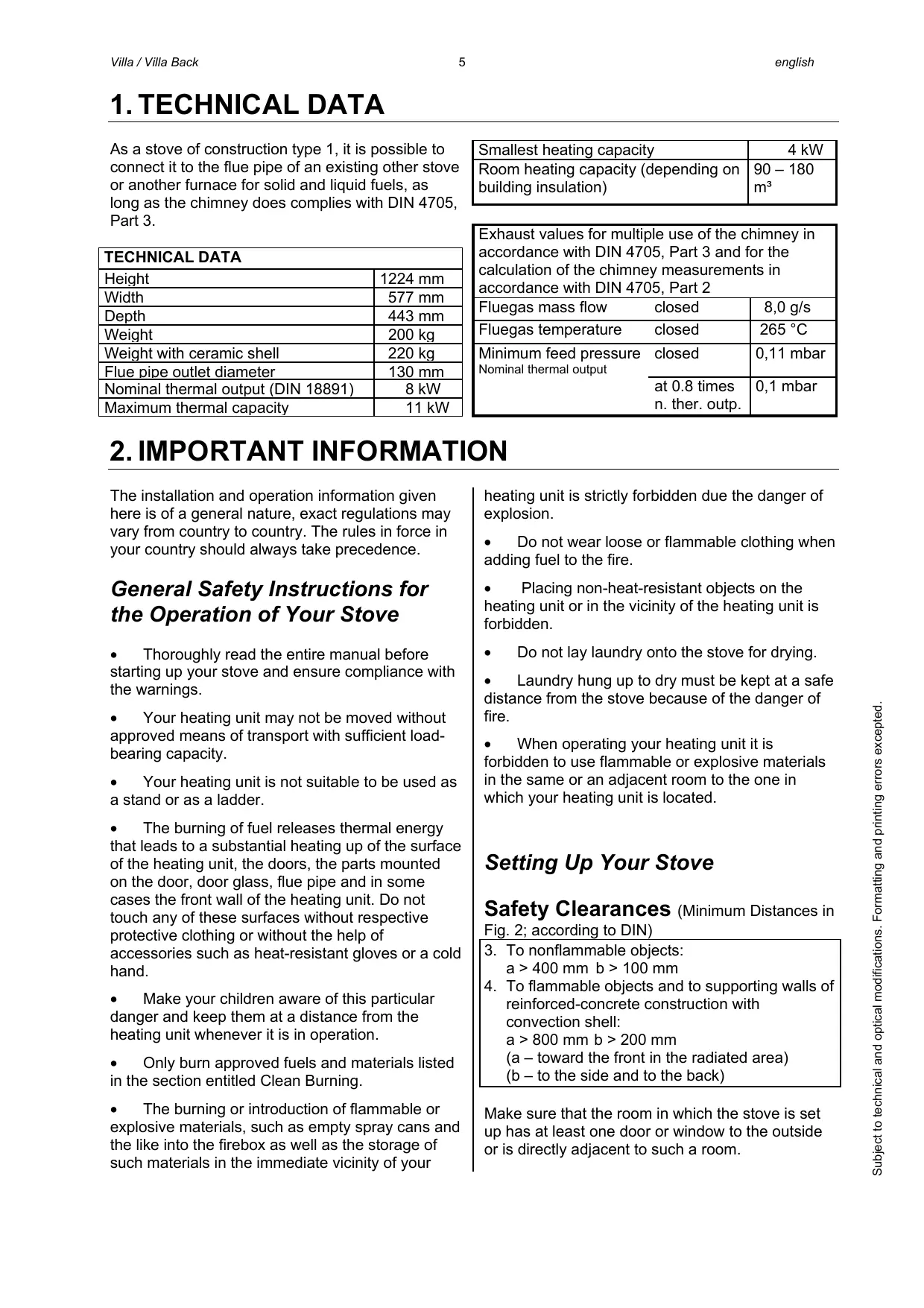 reinforced-concrete construction with convection shell: a > 800 mm b > 200 mm (a – toward the front in the radiated area) (b – to the side and to the back) Make sure that the room in which the stove is set up has at least one door or window to the outside or is directly adjacent to such a room. Subject to technical and optical modifications. Formatting and printing errors excepted.