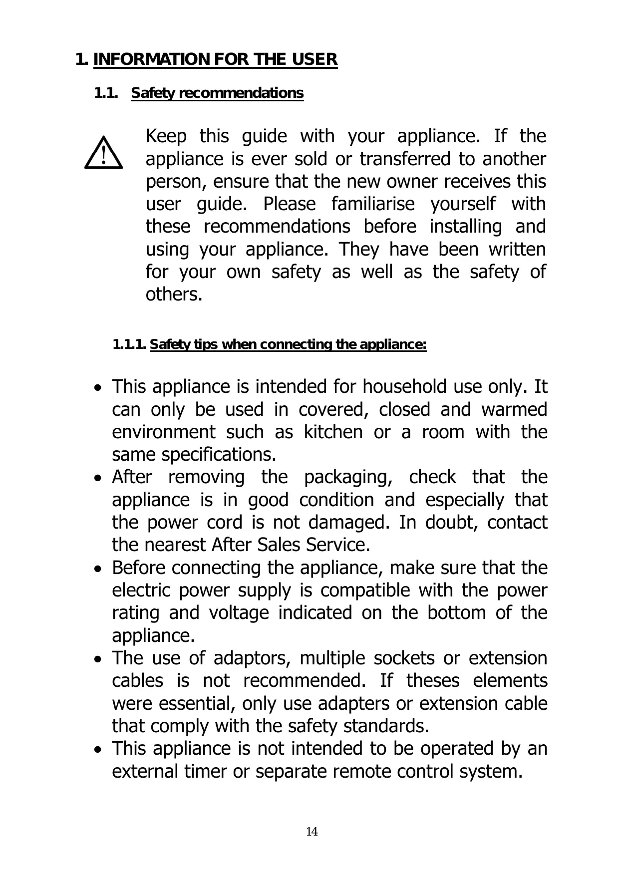 Keep this guide with your appliance. If the appliance is ever sold or transferred to another person, ensure that the new owner receives this user guide. Please familiarise yourself with these recommendations before installing and using your appliance. They have been written for your own safety as well as the safety of others.