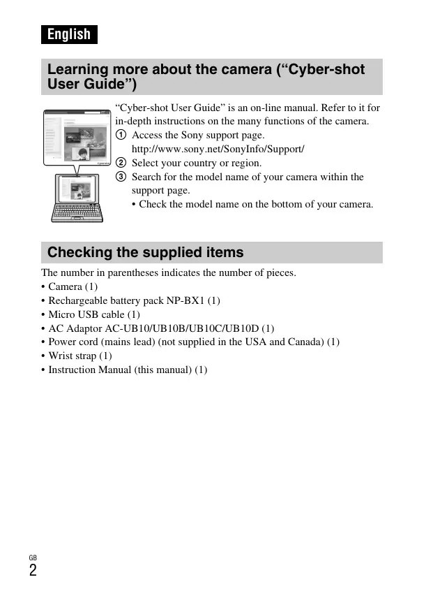 The number in parentheses indicates the number of pieces. • Camera (1) • Rechargeable battery pack NP-BX1 (1) • Micro USB cable (1) • AC Adaptor AC-UB10/UB10B/UB10C/UB10D (1) • Power cord (mains lead) (not supplied in the USA and Canada) (1) • Wrist strap (1) • Instruction Manual (this manual) (1)