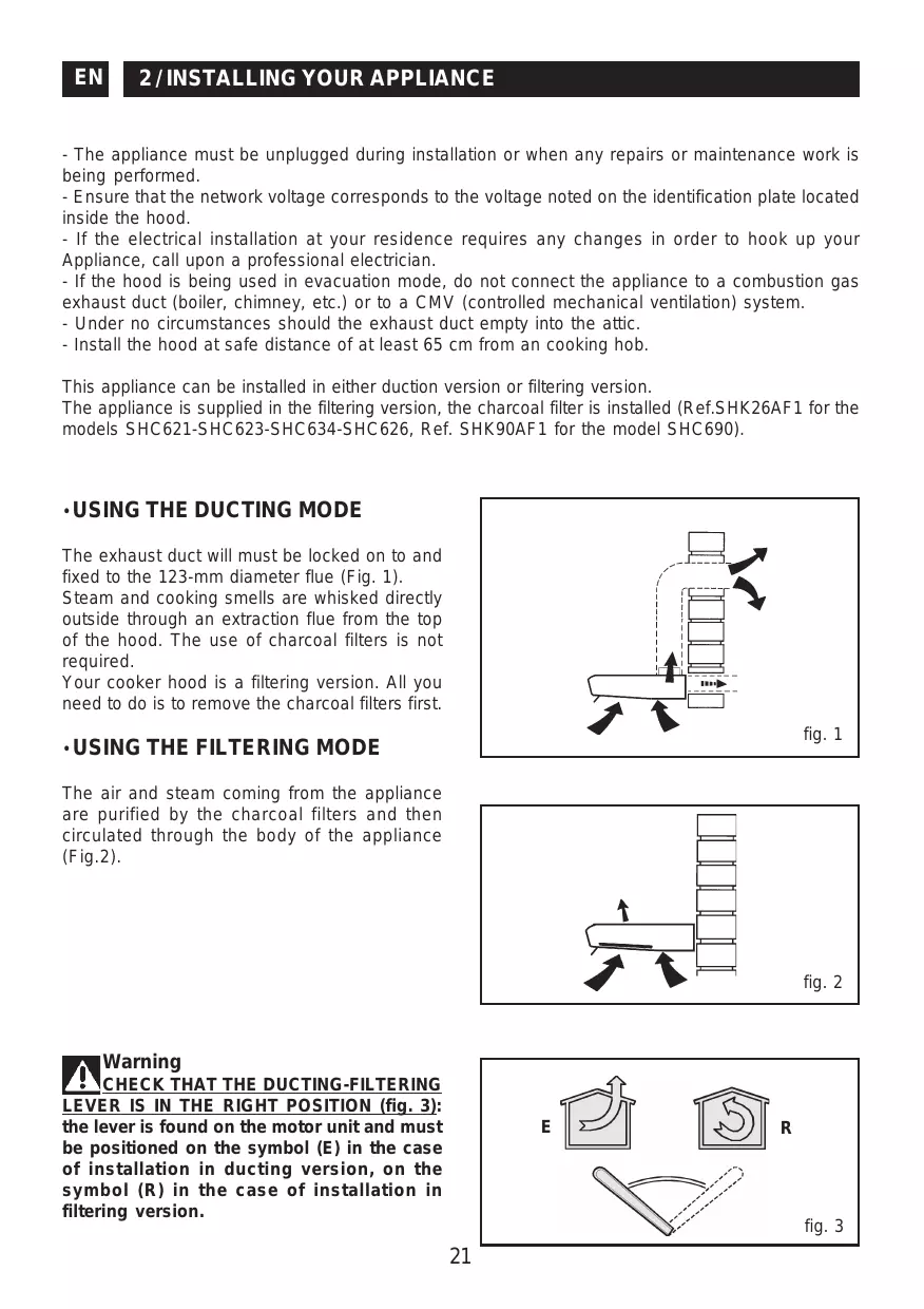 - The appliance must be unplugged during installation or when any repairs or maintenance work is being performed. - Ensure that the network voltage corresponds to the voltage noted on the identification plate located inside the hood. - If the electrical installation at your residence requires any changes in order to hook up your Appliance, call upon a professional electrician. - If the hood is being used in evacuation mode, do not connect the appliance to a combustion gas exhaust duct (boiler, chimney, etc.) or to a CMV (controlled mechanical ventilation) system. - Under no circumstances should the exhaust duct empty into the attic. - Install the hood at safe distance of at least 65 cm from an cooking hob. This appliance can be installed in either duction version or filtering version. The appliance is supplied in the filtering version, the charcoal filter is installed (Ref.SHK26AF1 for the models SHC621-SHC623-SHC634-SHC626, Ref. SHK90AF1 for the model SHC690).