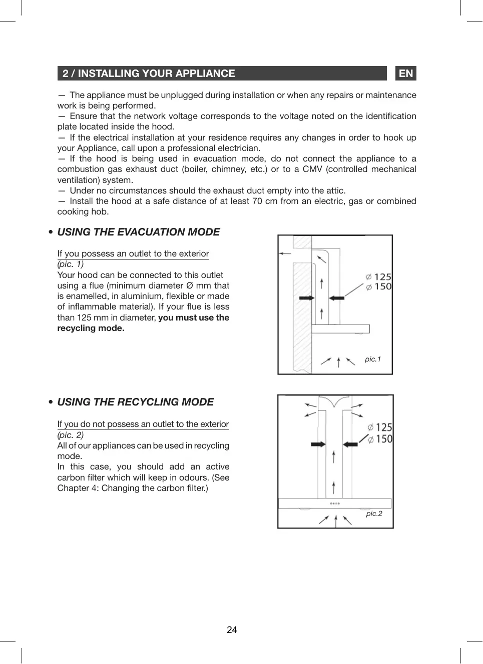 - USING THE EVACUATION MODE If you possess an outlet to the exterior (pic. 1) Your hood can be connected to this outlet using a flue (minimum diameter Ø mm that is enamelled, in aluminium, flexible or made of inflammable material). If your flue is less than 125 mm in diameter, you must use the recycling mode. pic.1