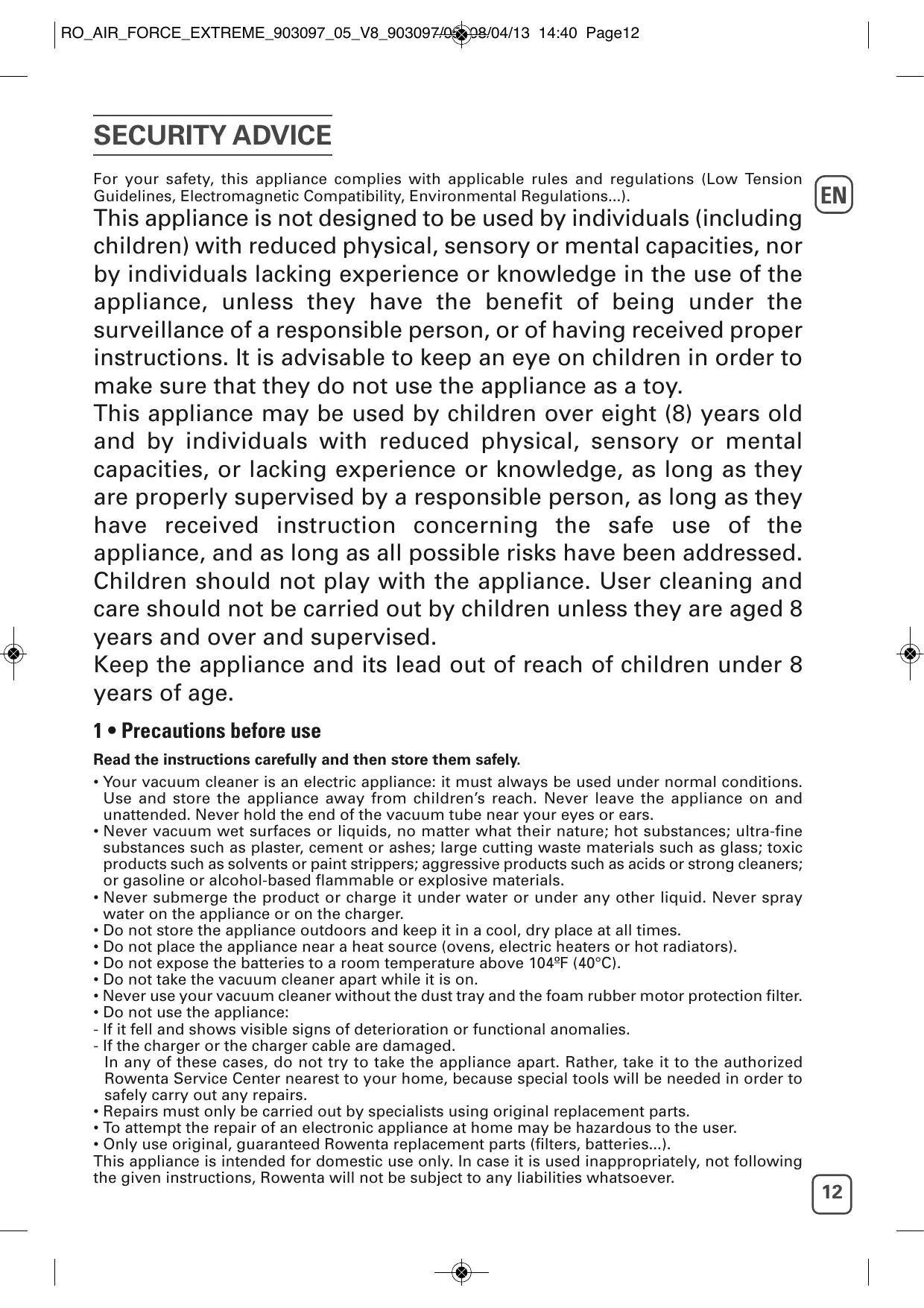 - Only use original, guaranteed Rowenta replacement parts (filters, batteries...). This appliance is intended for domestic use only. In case it is used inappropriately, not following the given instructions, Rowenta will not be subject to any liabilities whatsoever.