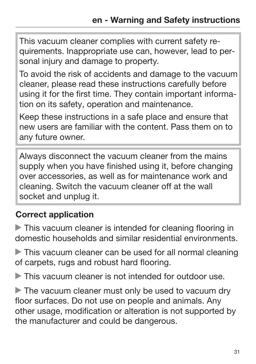 en - Warning and Safety instructions This vacuum cleaner complies with current safety requirements. Inappropriate use can, however, lead to personal injury and damage to property. To avoid the risk of accidents and damage to the vacuum cleaner, please read these instructions carefully before using it for the first time. They contain important information on its safety, operation and maintenance. Keep these instructions in a safe place and ensure that new users are familiar with the content. Pass them on to any future owner. Always disconnect the vacuum cleaner from the mains supply when you have finished using it, before changing over accessories, as well as for maintenance work and cleaning. Switch the vacuum cleaner off at the wall socket and unplug it. Correct application This vacuum cleaner is intended for cleaning flooring in domestic households and similar residential environments. This vacuum cleaner can be used for all normal cleaning of carpets, rugs and robust hard flooring. This vacuum cleaner is not intended for outdoor use. The vacuum cleaner must only be used to vacuum dry floor surfaces. Do not use on people and animals. Any other usage, modification or alteration is not supported by the manufacturer and could be dangerous.