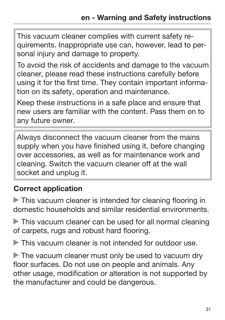 N'utilisez que des sacs à poussière, des filtres et des accessoires portant le logo "Original Miele". Le fabricant ne peut garantir votre sécurité que dans ces conditions. Miele ne peut pas être tenu pour responsable pour les dommages qui résulteraient d'une mauvaise utilisation et qui iraient à l'encontre des consignes de sécurité.