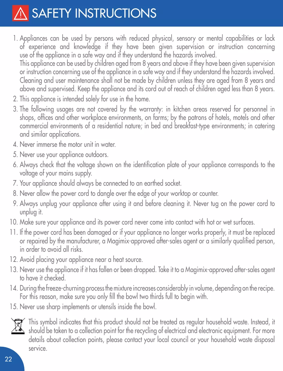 13. Never use the appliance if it has fallen or been dropped. Take it to a Magimix-approved after-sales agent