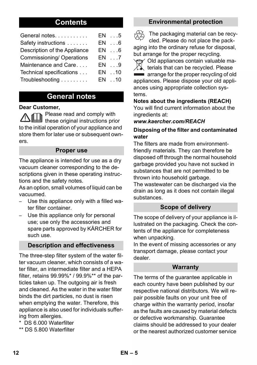 r.c wi om n! General notes. . . . . . . . . . . Safety instructions . . . . . . . Description of the Appliance Commissioning/ Operations Maintenance and Care. . . . Technical specifications . . . Troubleshooting . . . . . . . . . General notes Dear Customer, Please read and comply with these original instructions prior to the initial operation of your appliance and store them for later use or subsequent owners. Proper use The appliance is intended for use as a dry vacuum cleaner corresponding to the descriptions given in these operating instructions and the safety notes. As an option, small volumes of liquid can be vacuumed. – Use this appliance only with a filled water filter container. – Use this appliance only for personal use; use only the accessories and spare parts approved by KÄRCHER for such use. Description and effectiveness The three-step filter system of the water filter vacuum cleaner, which consists of a water filter, an intermediate filter and a HEPA filter, retains 99.99%* / 99.9%** of the particles taken up. The outgoing air is fresh and cleaned. As the water in the water filter binds the dirt particles, no dust is risen when emptying the water. Therefore, this appliance is also used for individuals suffering from allergies.