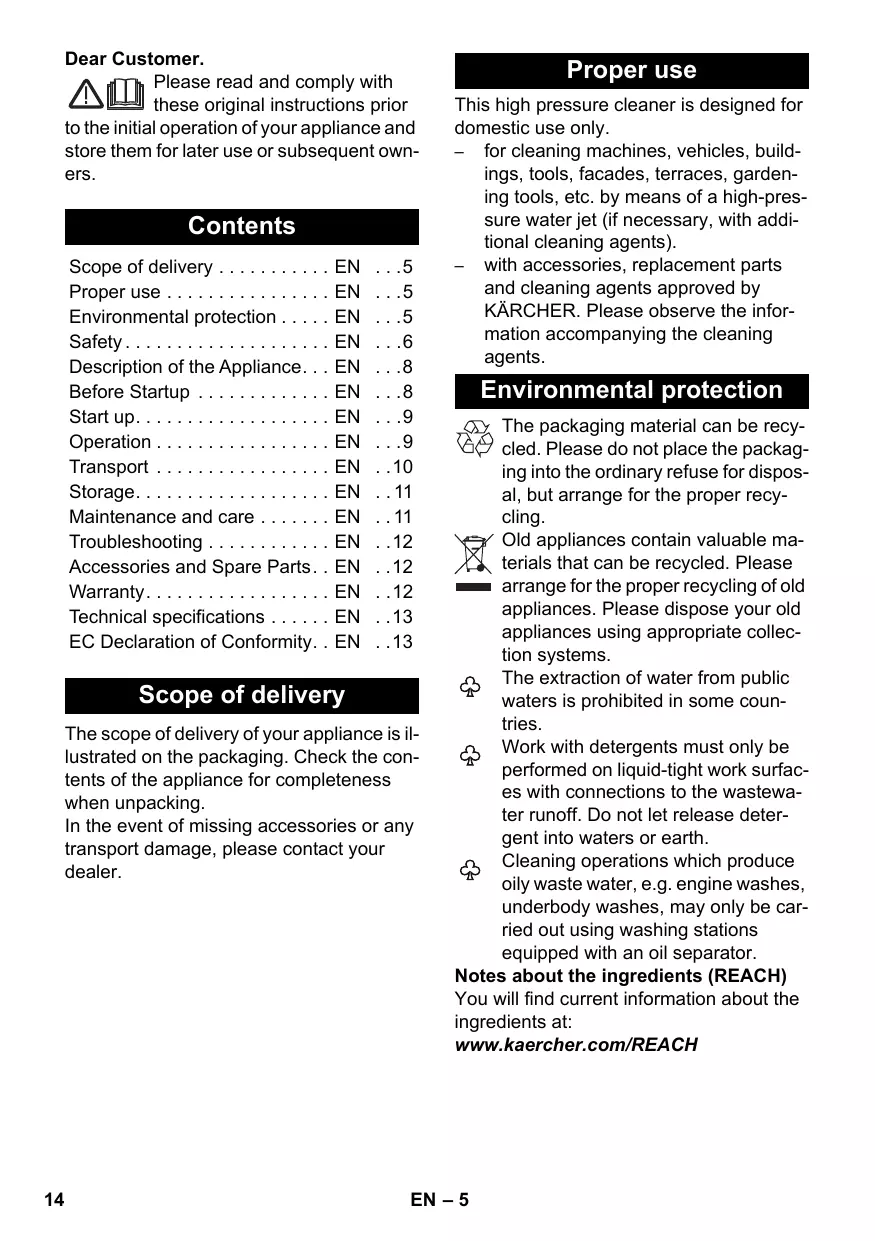 This high pressure cleaner is designed for domestic use only. – for cleaning machines, vehicles, buildings, tools, facades, terraces, gardening tools, etc. by means of a high-pressure water jet (if necessary, with additional cleaning agents). – with accessories, replacement parts and cleaning agents approved by KÄRCHER. Please observe the information accompanying the cleaning agents.