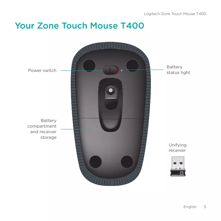 English Logitech Zone Touch Mouse T400 Your Zone Touch Mouse T400 Power switch Battery status light Battery compartment and receiver storage Unifying receiver English