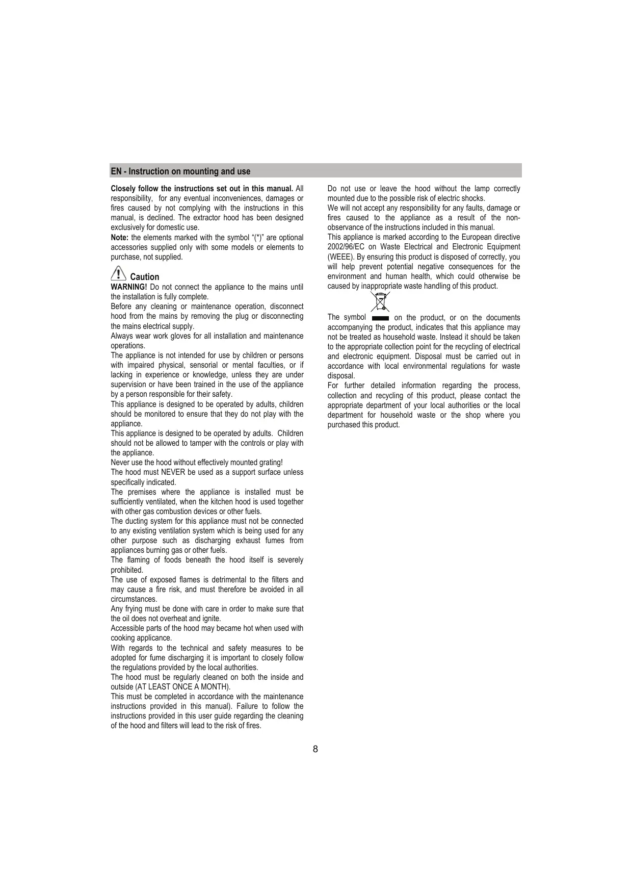 EN - Instruction on mounting and use Do not use or leave the hood without the lamp correctly mounted due to the possible risk of electric shocks. We will not accept any responsibility for any faults, damage or fires caused to the appliance as a result of the nonobservance of the instructions included in this manual. This appliance is marked according to the European directive 2002/96/EC on Waste Electrical and Electronic Equipment (WEEE). By ensuring this product is disposed of correctly, you will help prevent potential negative consequences for the environment and human health, which could otherwise be caused by inappropriate waste handling of this product. Closely follow the instructions set out in this manual. All responsibility, for any eventual inconveniences, damages or fires caused by not complying with the instructions in this manual, is declined. The extractor hood has been designed exclusively for domestic use. Note: the elements marked with the symbol “(*)” are optional accessories supplied only with some models or elements to purchase, not supplied. Caution WARNING! Do not connect the appliance to the mains until the installation is fully complete. Before any cleaning or maintenance operation, disconnect hood from the mains by removing the plug or disconnecting the mains electrical supply. Always wear work gloves for all installation and maintenance operations. The appliance is not intended for use by children or persons with impaired physical, sensorial or mental faculties, or if lacking in experience or knowledge, unless they are under supervision or have been trained in the use of the appliance by a person responsible for their safety. This appliance is designed to be operated by adults, children should be monitored to ensure that they do not play with the appliance. This appliance is designed to be operated by adults. Children should not be allowed to tamper with the controls or play with the appliance. Never use the hood without effectively mounted grating! The hood must NEVER be used as a support surface unless specifically indicated. The premises where the appliance is installed must be sufficiently ventilated, when the kitchen hood is used together with other gas combustion devices or other fuels. The ducting system for this appliance must not be connected to any existing ventilation system which is being used for any other purpose such as discharging exhaust fumes from appliances burning gas or other fuels. The flaming of foods beneath the hood itself is severely prohibited. The use of exposed flames is detrimental to the filters and may cause a fire risk, and must therefore be avoided in all circumstances. Any frying must be done with care in order to make sure that the oil does not overheat and ignite. Accessible parts of the hood may became hot when used with cooking applicance. With regards to the technical and safety measures to be adopted for fume discharging it is important to closely follow the regulations provided by the local authorities. The hood must be regularly cleaned on both the inside and outside (AT LEAST ONCE A MONTH). This must be completed in accordance with the maintenance instructions provided in this manual). Failure to follow the instructions provided in this user guide regarding the cleaning of the hood and filters will lead to the risk of fires. The symbol on the product, or on the documents accompanying the product, indicates that this appliance may not be treated as household waste. Instead it should be taken to the appropriate collection point for the recycling of electrical and electronic equipment. Disposal must be carried out in accordance with local environmental regulations for waste disposal. For further detailed information regarding the process, collection and recycling of this product, please contact the appropriate department of your local authorities or the local department for household waste or the shop where you purchased this product.