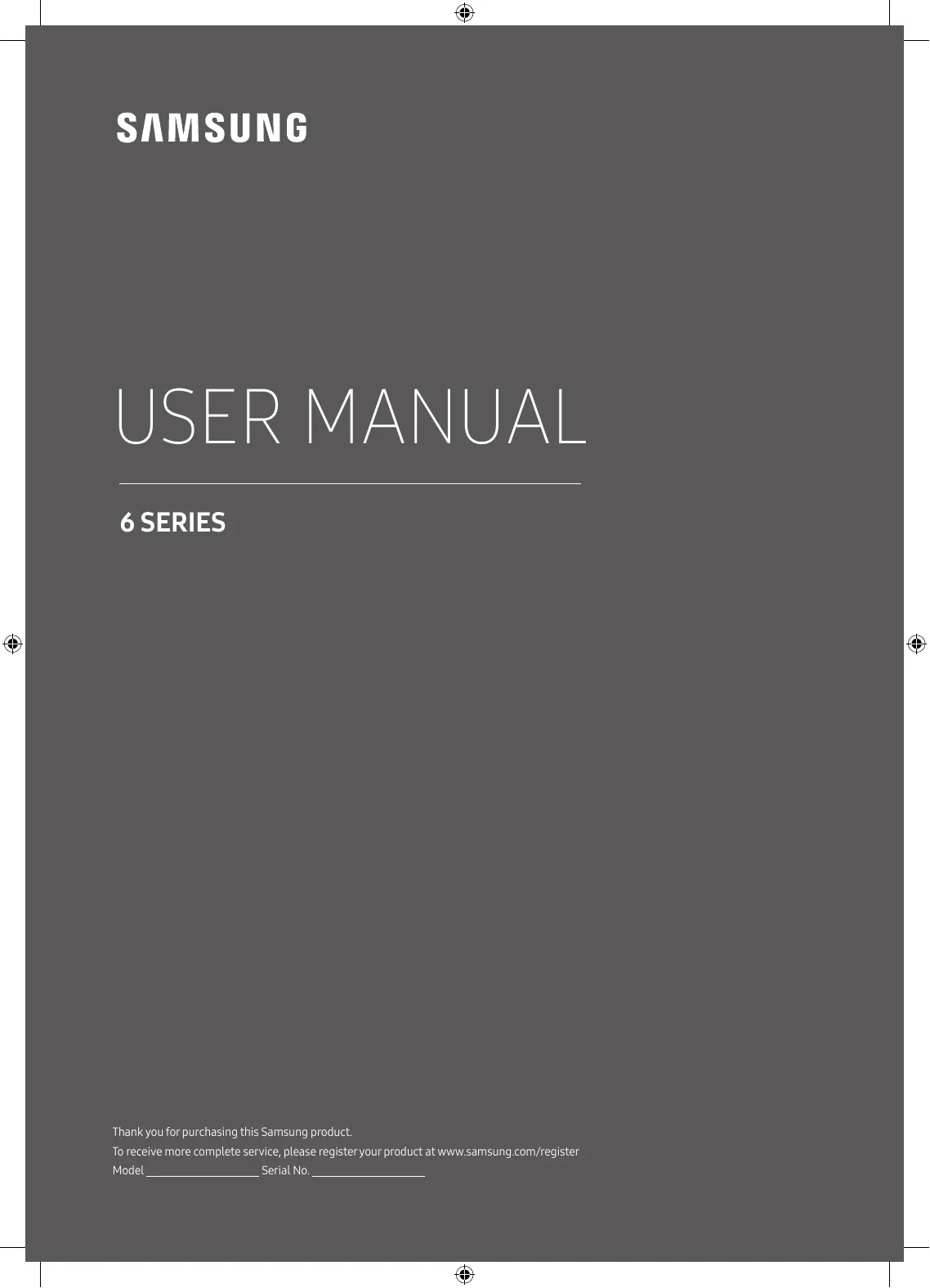 Thank you for purchasing this Samsung product. To receive more complete service, please register your product at www.samsung.com/register Model Serial No. Before Reading This User Manual This TV comes with this user manual and an embedded e-Manual. Before reading this user manual, review the following: User Manual Read this provided user manual to see information about product safety, installation, accessories, initial configuration, and product specifications. e-Manual For more information about this TV, read the e-Manual embedded in the product.