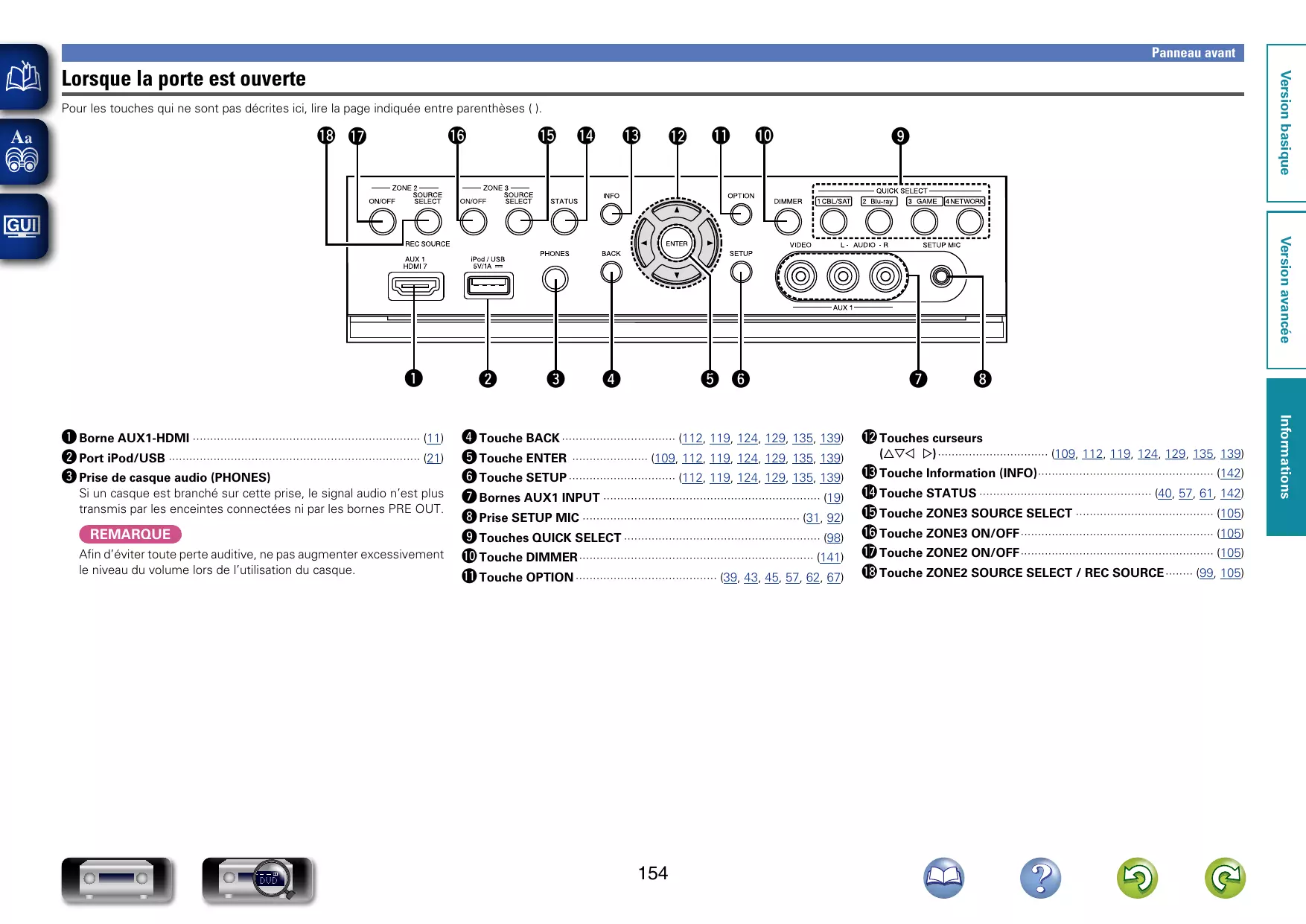 Lecture (Utilisation avancée)······················································95 Fonction de contrôle HDMI·························································95 Fonction de minuterie sommeil···················································97 Fonction de sélection rapide························································98 Mode REC OUT···········································································99 Fonction de contrôle Internet····················································100 Différentes fonctions de mémoire·············································102 Lecture dans la ZONE2/ZONE3 (Autre pièce)··························103 Sortie audio················································································103 Sortie vidéo················································································104 Lecture······················································································105 Fonction de minuterie sommeil·················································105 Comment effectuer des réglages précis··································106 Plan du menu de l’interface graphique······································106 Exemples d’affichages de l’écran du menu·······························108 Exemples d’affichage de menu et d’affichage en façade··········109 Saisie de caractères···································································110 Audio·························································································112 Vidéo··························································································119 Entrées······················································································124 Commande des composants·····················································149 Spécification de la zone utilisée avec la télécommande············151 Réinitialisation de la télécommande··········································151