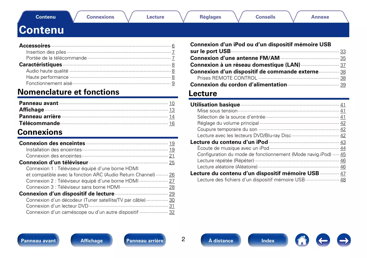Mise sous tension··········································································· 41 Sélection de la source d’entrée······················································· 41 Réglage du volume principal··························································· 42 Coupure temporaire du son···························································· 42 Lecture avec les lecteurs DVD/Blu-ray Disc···································· 42 Lecture du contenu d’un iPod····················································· 43 Écoute de musique avec un iPod···················································· 44 Configuration du mode de fonctionnement (Mode navig.iPod)······ 45 Lecture répétée (Répéter)······························································· 46 Lecture aléatoire (Aléatoire)···························································· 46 Lecture du contenu d’un dispositif mémoire USB··············· 47 Lecture des fichiers d’un dispositif mémoire USB·························· 48