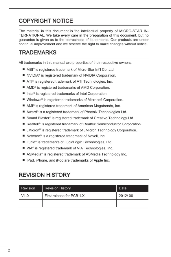 MSI® is registered trademark of Micro-Star Int’l Co.,Ltd. NVIDIA® is registered trademark of NVIDIA Corporation. ATI® is registered trademark of ATI Technologies, Inc. AMD® is registered trademarks of AMD Corporation. Intel® is registered trademarks of Intel Corporation. Windows® is registered trademarks of Microsoft Corporation. AMI® is registered trademark of American Megatrends, Inc. Award® is a registered trademark of Phoenix Technologies Ltd. Sound Blaster® is registered trademark of Creative Technology Ltd. Realtek® is registered trademark of Realtek Semiconductor Corporation. JMicron® is registered trademark of JMicron Technology Corporation. Netware® is a registered trademark of Novell, Inc. Lucid® is trademarks of LucidLogix Technologies, Ltd. VIA® is registered trademark of VIA Technologies, Inc. ASMedia® is registered trademark of ASMedia Technology Inc. iPad, iPhone, and iPod are trademarks of Apple Inc.