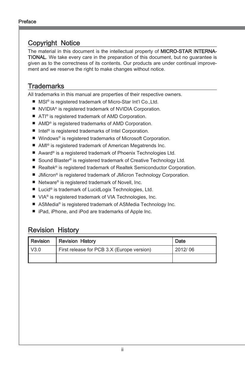 G52-77581XF Preface Copyright Notice The material in this document is the intellectual property of MICRO-STAR INTERNATIONAL. We take every care in the preparation of this document, but no guarantee is given as to the correctness of its contents. Our products are under continual improvement and we reserve the right to make changes without notice. Trademarks All trademarks in this manual are properties of their respective owners. ■ MSI® is registered trademark of Micro-Star Int’l Co.,Ltd. ■ NVIDIA® is registered trademark of NVIDIA Corporation. ■ ATI® is registered trademark of AMD Corporation. ■ AMD® is registered trademarks of AMD Corporation. ■ Intel® is registered trademarks of Intel Corporation. ■ Windows® is registered trademarks of Microsoft Corporation. ■ AMI® is registered trademark of American Megatrends Inc. ■ Award® is a registered trademark of Phoenix Technologies Ltd. ■ Sound Blaster® is registered trademark of Creative Technology Ltd. ■ Realtek® is registered trademark of Realtek Semiconductor Corporation. ■ JMicron® is registered trademark of JMicron Technology Corporation. ■ Netware® is registered trademark of Novell, Inc. ■ Lucid® is trademark of LucidLogix Technologies, Ltd. ■ VIA® is registered trademark of VIA Technologies, Inc. ■ ASMedia® is registered trademark of ASMedia Technology Inc. ■ iPad, iPhone, and iPod are trademarks of Apple Inc. Revision History Revision Revision History Date V3.0 First release for PCB 3.X (Europe version) 2012/ 06