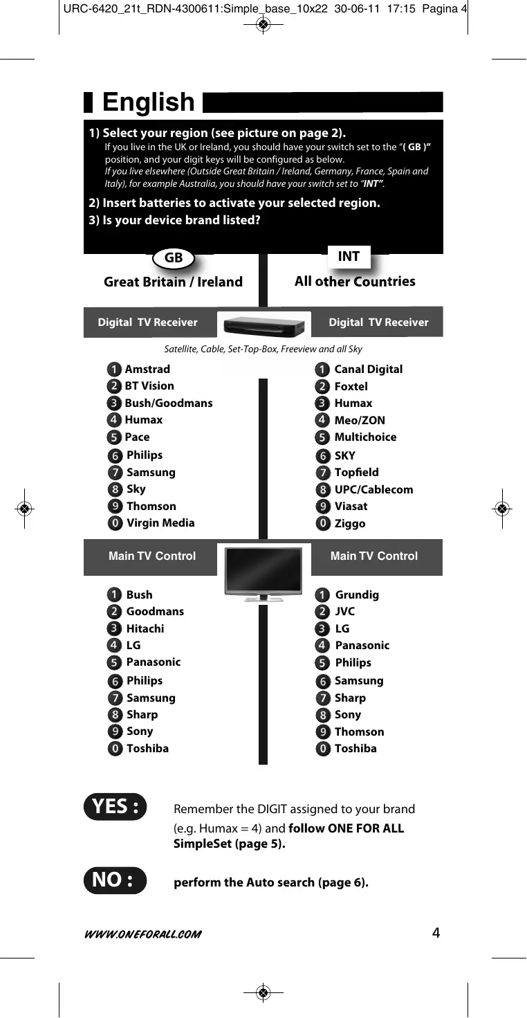 Follow the Auto search procedure on page 6. Your particular device does NoT switch back oN? Switch your device back ON manually (or using the original remote) and repeat SimpleSet making sure to release the “DIGIT KEY assigned to your brand” as soon as your device switches OFF. Your oNE FoR All is not working properly? There may be a better configuration for your device brand. Please repeat SimpleSet. If still not successful please follow the Auto search procedure.