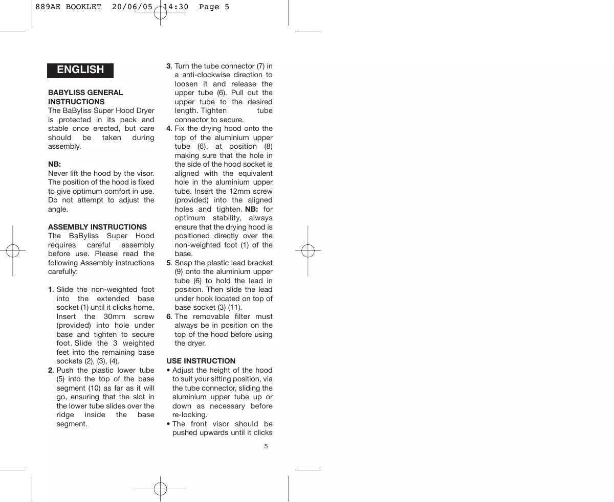 ENGLISH BABYLISS GENERAL INSTRUCTIONS The BaByliss Super Hood Dryer is protected in its pack and stable once erected, but care should be taken during assembly.
