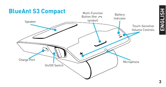 C O M P A C T CAR SPEAKERPHONE User Guide Speaker Multi-Function Button (the symbol) Battery Indicator Touch-Sensitive Volume Controls Charge Port On/Off Switch ENGLISH BlueAnt S3 Compact Microphone BlueAnt