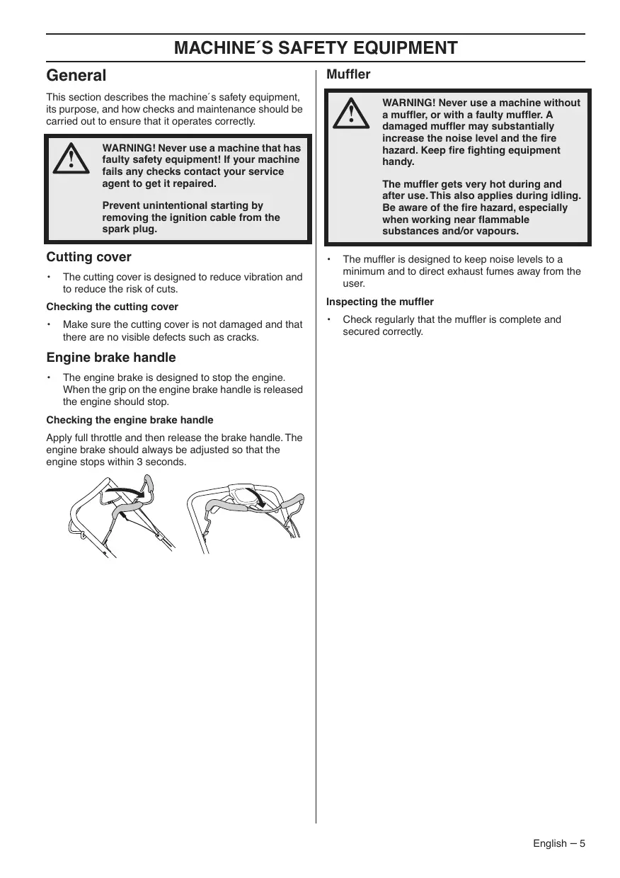 The engine brake is designed to stop the engine. When the grip on the engine brake handle is released the engine should stop. Checking the engine brake handle Apply full throttle and then release the brake handle. The engine brake should always be adjusted so that the engine stops within 3 seconds. English – 5
