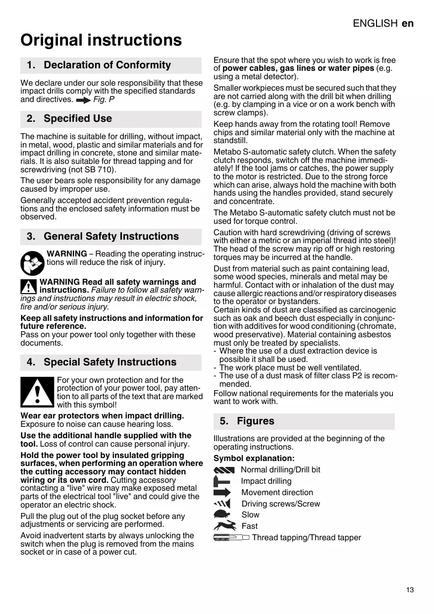 Smaller workpieces must be secured such that they are not carried along with the drill bit when drilling (e.g. by clamping in a vice or on a work bench with screw clamps). Keep hands away from the rotating tool! Remove chips and similar material only with the machine at standstill. Metabo S-automatic safety clutch. When the safety clutch responds, switch off the machine immediately! If the tool jams or catches, the power supply to the motor is restricted. Due to the strong force which can arise, always hold the machine with both hands using the handles provided, stand securely and concentrate. The Metabo S-automatic safety clutch must not be used for torque control. Caution with hard screwdriving (driving of screws with either a metric or an imperial thread into steel)! The head of the screw may rip off or high restoring torques may be incurred at the handle. Dust from material such as paint containing lead, some wood species, minerals and metal may be harmful. Contact with or inhalation of the dust may cause allergic reactions and/or respiratory diseases to the operator or bystanders. Certain kinds of dust are classified as carcinogenic such as oak and beech dust especially in conjunction with additives for wood conditioning (chromate, wood preservative). Material containing asbestos must only be treated by specialists. - Where the use of a dust extraction device is possible it shall be used. - The work place must be well ventilated. - The use of a dust mask of filter class P2 is recommended. Follow national requirements for the materials you want to work with.