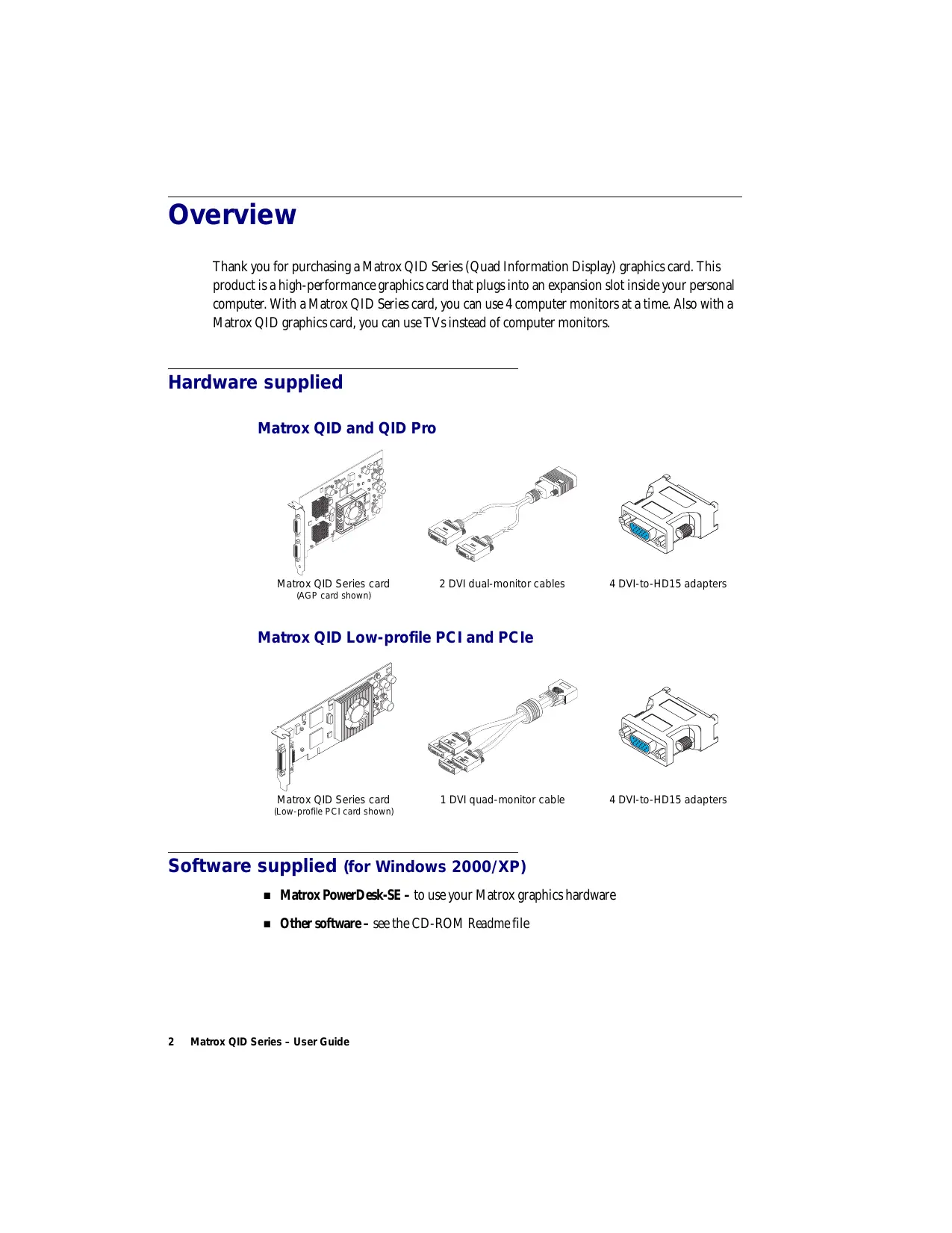 www.matrox.com/graphics Overview Thank you for purchasing a Matrox QID Series (Quad Information Display) graphics card. This product is a high-performance graphics card that plugs into an expansion slot inside your personal computer. With a Matrox QID Series card, you can use 4 computer monitors at a time. Also with a Matrox QID graphics card, you can use TVs instead of computer monitors. Hardware supplied Matrox QID and QID Pro Matrox QID Series card 2 DVI dual-monitor cables 4 DVI-to-HD15 adapters (AGP card shown) Matrox QID Low-profile PCI and PCIe Matrox QID Series card 1 DVI quad-monitor cable 4 DVI-to-HD15 adapters (Low-profile PCI card shown) Software supplied (for Windows 2000/XP)