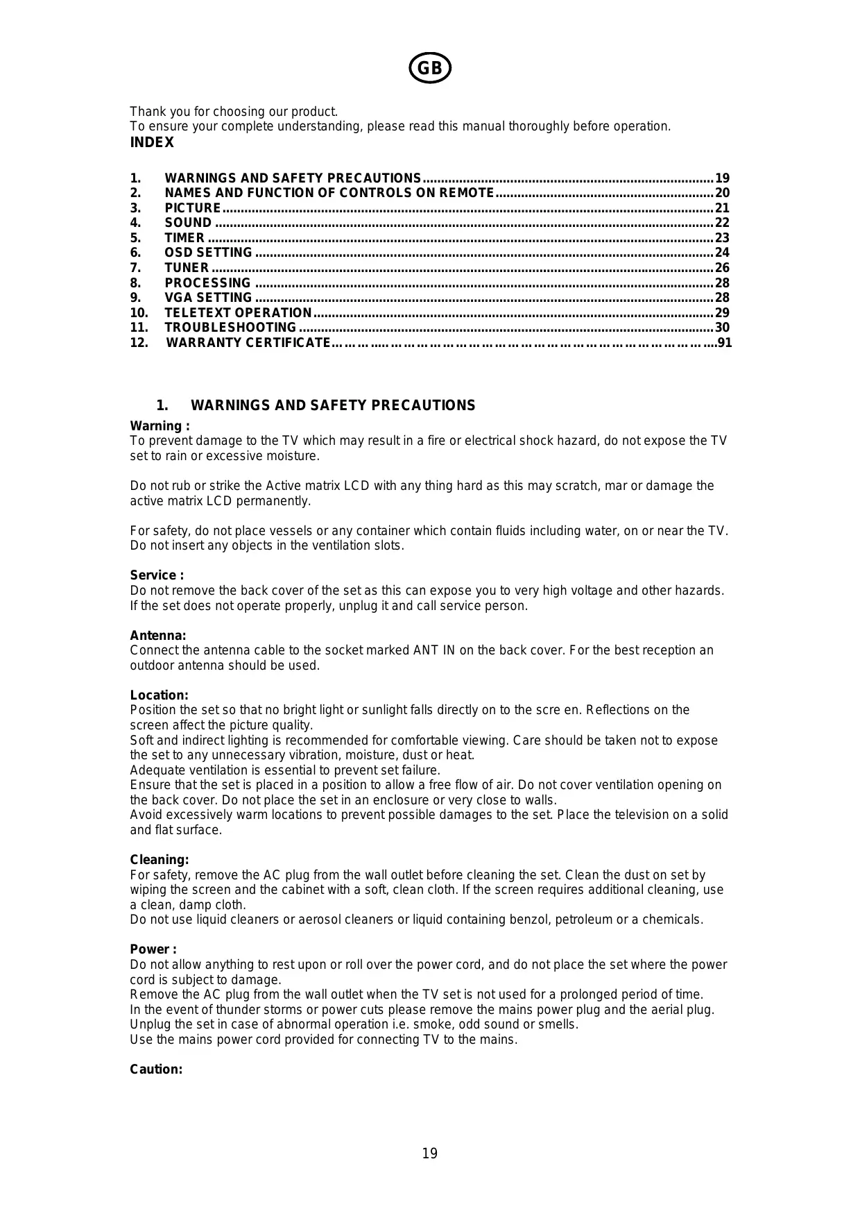 To prevent damage to the TV which may result in a fire or electrical shock hazard, do not expose the TV set to rain or excessive moisture. Do not rub or strike the Active matrix LCD with any thing hard as this may scratch, mar or damage the active matrix LCD permanently. For safety, do not place vessels or any container which contain fluids including water, on or near the TV. Do not insert any objects in the ventilation slots. Service : Do not remove the back cover of the set as this can expose you to very high voltage and other hazards. If the set does not operate properly, unplug it and call service person. Antenna: Connect the antenna cable to the socket marked ANT IN on the back cover. For the best reception an outdoor antenna should be used. Location: Position the set so that no bright light or sunlight falls directly on to the scre en. Reflections on the screen affect the picture quality. Soft and indirect lighting is recommended for comfortable viewing. Care should be taken not to expose the set to any unnecessary vibration, moisture, dust or heat. Adequate ventilation is essential to prevent set failure. Ensure that the set is placed in a position to allow a free flow of air. Do not cover ventilation opening on the back cover. Do not place the set in an enclosure or very close to walls. Avoid excessively warm locations to prevent possible damages to the set. Place the television on a solid and flat surface. Cleaning: For safety, remove the AC plug from the wall outlet before cleaning the set. Clean the dust on set by wiping the screen and the cabinet with a soft, clean cloth. If the screen requires additional cleaning, use a clean, damp cloth. Do not use liquid cleaners or aerosol cleaners or liquid containing benzol, petroleum or a chemicals. Power : Do not allow anything to rest upon or roll over the power cord, and do not place the set where the power cord is subject to damage. Remove the AC plug from the wall outlet when the TV set is not used for a prolonged period of time. In the event of thunder storms or power cuts please remove the mains power plug and the aerial plug. Unplug the set in case of abnormal operation i.e. smoke, odd sound or smells. Use the mains power cord provided for connecting TV to the mains. Caution: