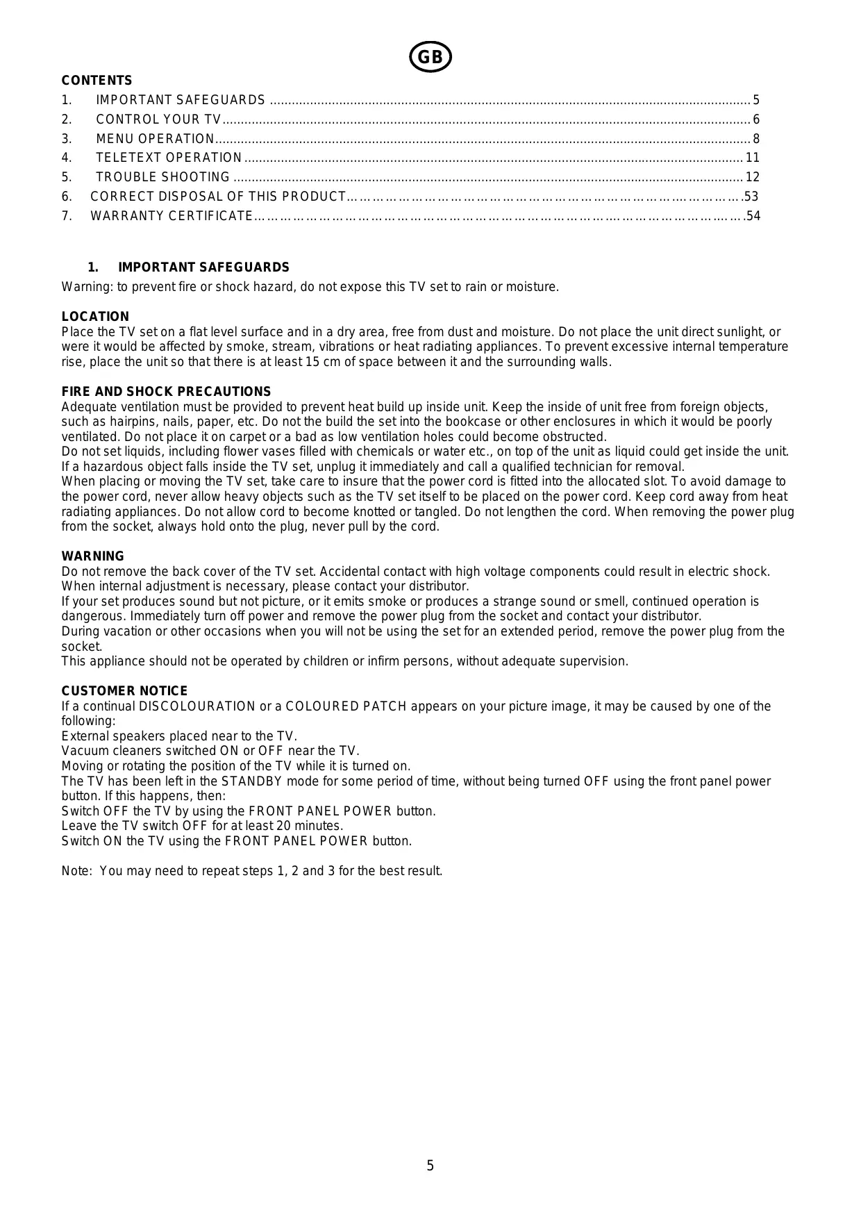 Adequate ventilation must be provided to prevent heat build up inside unit. Keep the inside of unit free from foreign objects, such as hairpins, nails, paper, etc. Do not the build the set into the bookcase or other enclosures in which it would be poorly ventilated. Do not place it on carpet or a bad as low ventilation holes could become obstructed. Do not set liquids, including flower vases filled with chemicals or water etc., on top of the unit as liquid could get inside the unit. If a hazardous object falls inside the TV set, unplug it immediately and call a qualified technician for removal. When placing or moving the TV set, take care to insure that the power cord is fitted into the allocated slot. To avoid damage to the power cord, never allow heavy objects such as the TV set itself to be placed on the power cord. Keep cord away from heat radiating appliances. Do not allow cord to become knotted or tangled. Do not lengthen the cord. When removing the power plug from the socket, always hold onto the plug, never pull by the cord. WARNING Do not remove the back cover of the TV set. Accidental contact with high voltage components could result in electric shock. When internal adjustment is necessary, please contact your distributor. If your set produces sound but not picture, or it emits smoke or produces a strange sound or smell, continued operation is dangerous. Immediately turn off power and remove the power plug from the socket and contact your distributor. During vacation or other occasions when you will not be using the set for an extended period, remove the power plug from the socket. This appliance should not be operated by children or infirm persons, without adequate supervision. CUSTOMER NOTICE If a continual DISCOLOURATION or a COLOURED PATCH appears on your picture image, it may be caused by one of the following: External speakers placed near to the TV. Vacuum cleaners switched ON or OFF near the TV. Moving or rotating the position of the TV while it is turned on. The TV has been left in the STANDBY mode for some period of time, without being turned OFF using the front panel power button. If this happens, then: Switch OFF the TV by using the FRONT PANEL POWER button. Leave the TV switch OFF for at least 20 minutes. Switch ON the TV using the FRONT PANEL POWER button. Note: You may need to repeat steps 1, 2 and 3 for the best result.