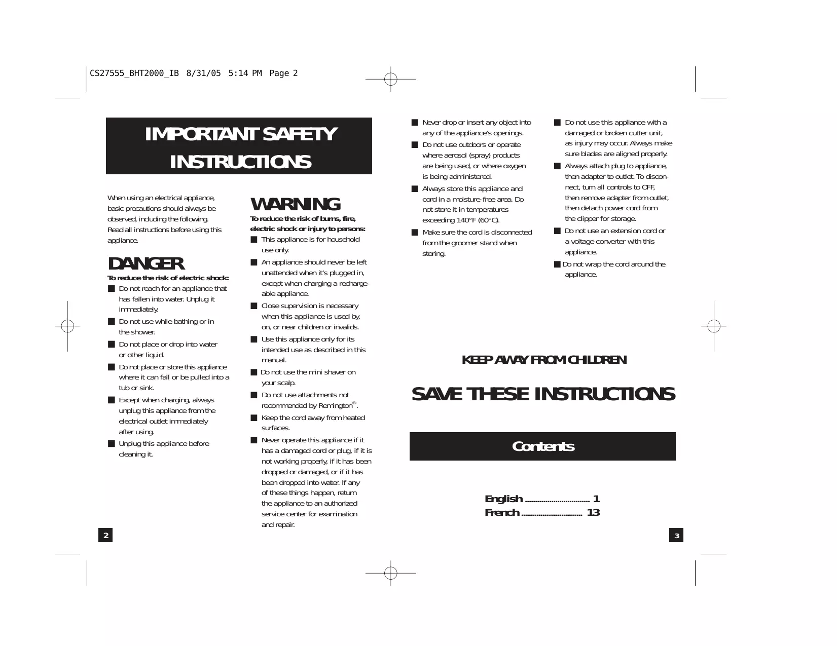 Download the instructions for your Hair clippers in PDF format for free! Find your manual BHT2000 - REMINGTON and take your electronic device back in hand. On this page are published all the documents necessary for the use of your device. BHT2000 by REMINGTON.