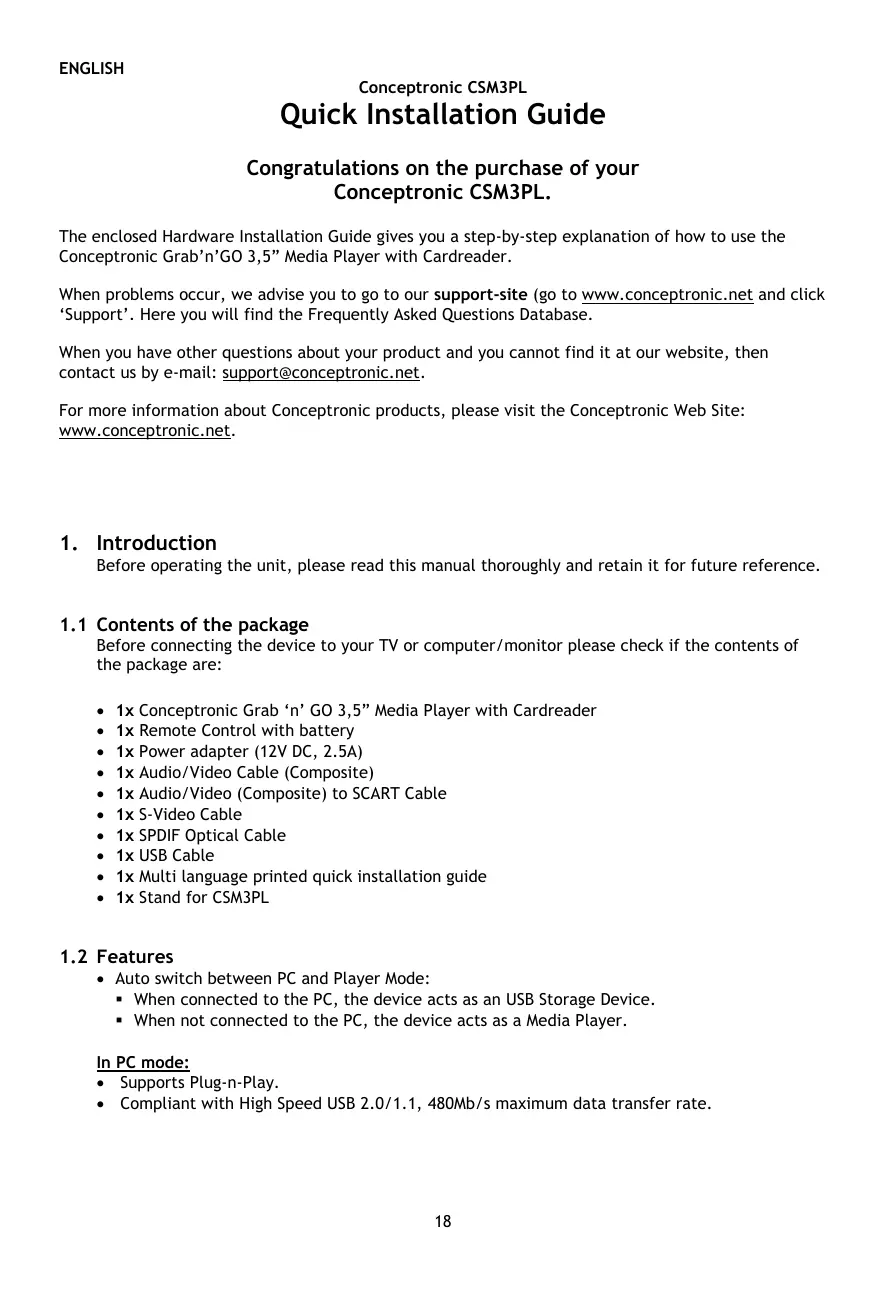 Congratulations on the purchase of your Conceptronic CSM3PL.
