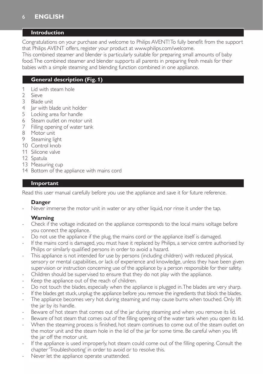 English Introduction Congratulations on your purchase and welcome to Philips AVENT! To fully benefit from the support that Philips AVENT offers, register your product at www.philips.com/welcome. This combined steamer and blender is particularly suitable for preparing small amounts of baby food. The combined steamer and blender supports all parents in preparing fresh meals for their babies with a simple steaming and blending function combined in one appliance. General description (Fig. 1)