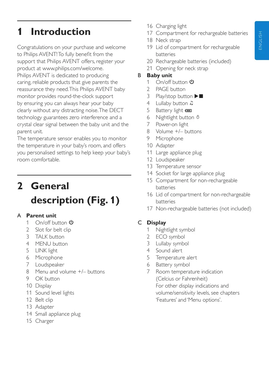 Congratulations on your purchase and welcome to Philips AVENT! To fully benefit from the support that Philips AVENT offers, register your product at www.philips.com/welcome. Philips AVENT is dedicated to producing caring, reliable products that give parents the reassurance they need. This Philips AVENT baby monitor provides round-the-clock support by ensuring you can always hear your baby clearly without any distracting noise. The DECT technology guarantees zero interference and a crystal clear signal between the baby unit and the parent unit. The temperature sensor enables you to monitor the temperature in your baby’s room, and offers you personalised settings to help keep your baby’s room comfortable. 2 General description (Fig. 1) A Parent unit 1 On/off button 3 2 Slot for belt clip 3 TALK button 4 MENU button 5 LINK light 6 Microphone 7 Loudspeaker 8 Menu and volume +/– buttons 9 OK button 10 Display 11 Sound level lights 12 Belt clip 13 Adapter 14 Small appliance plug 15 Charger