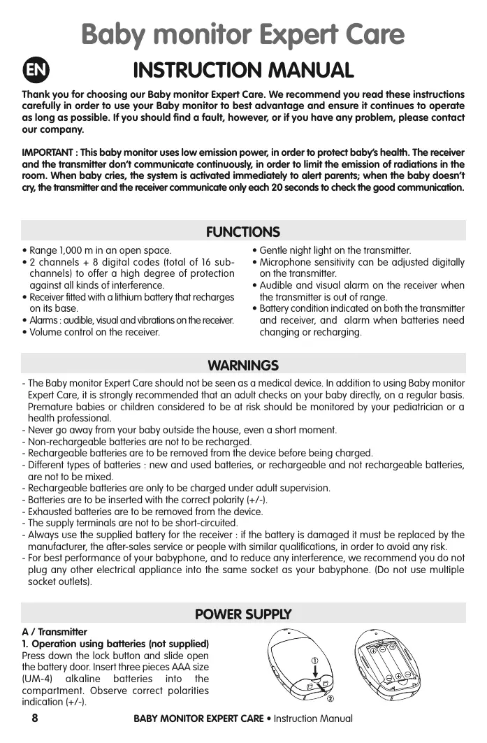 - The Baby monitor Expert Care should not be seen as a medical device. In addition to using Baby monitor Expert Care, it is strongly recommended that an adult checks on your baby directly, on a regular basis. Premature babies or children considered to be at risk should be monitored by your pediatrician or a health professional. - Never go away from your baby outside the house, even a short moment. - Non-rechargeable batteries are not to be recharged. - Rechargeable batteries are to be removed from the device before being charged. - Different types of batteries : new and used batteries, or rechargeable and not rechargeable batteries, are not to be mixed. - Rechargeable batteries are only to be charged under adult supervision. - Batteries are to be inserted with the correct polarity (+/-). - Exhausted batteries are to be removed from the device. - The supply terminals are not to be short-circuited. - Always use the supplied battery for the receiver : if the battery is damaged it must be replaced by the manufacturer, the after-sales service or people with similar qualifications, in order to avoid any risk. - For best performance of your babyphone, and to reduce any interference, we recommend you do not plug any other electrical appliance into the same socket as your babyphone. (Do not use multiple socket outlets).