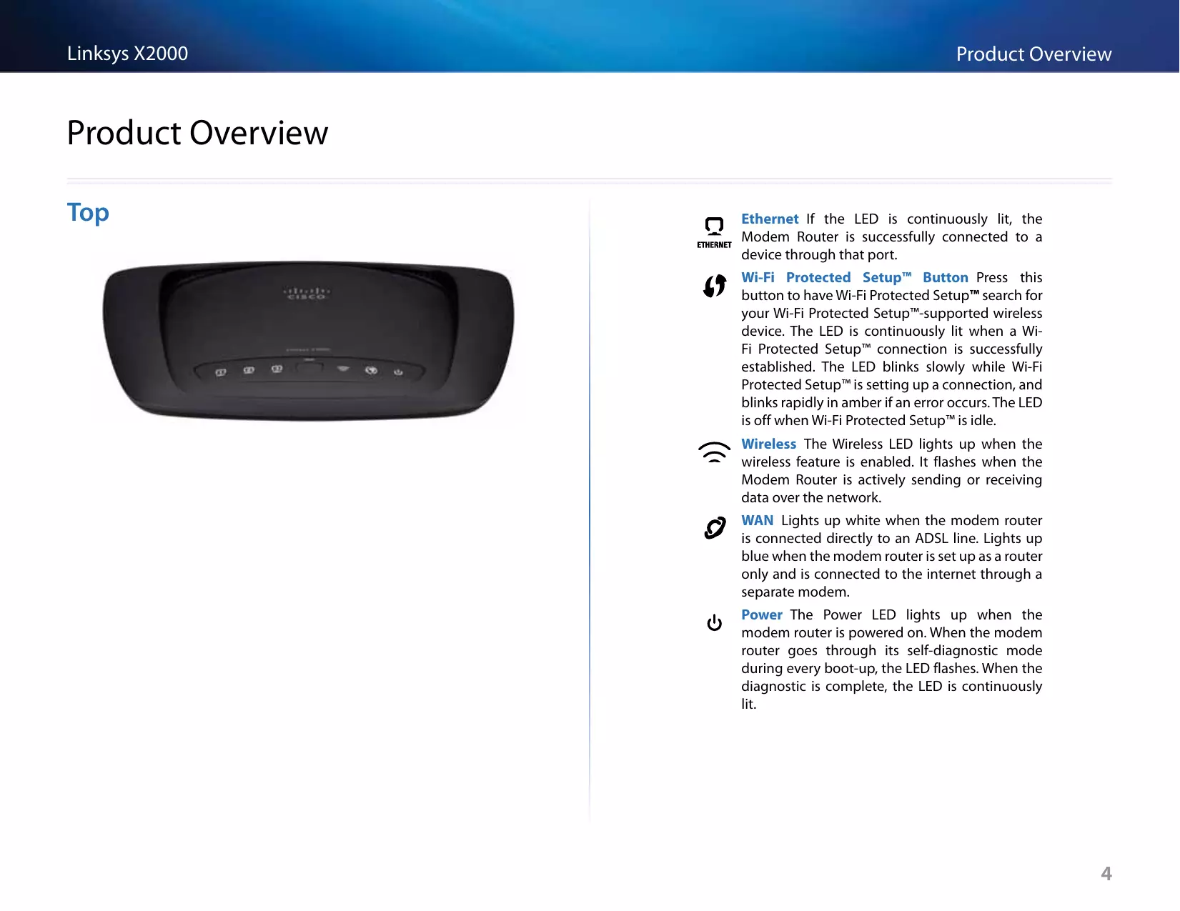 Modem Router is successfully connected to a device through that port. Wi-Fi Protected Setup™ Button Press this button to have Wi-Fi Protected Setup™ search for your Wi-Fi Protected Setup™-supported wireless device. The LED is continuously lit when a WiFi Protected Setup™ connection is successfully established. The LED blinks slowly while Wi-Fi Protected Setup™ is setting up a connection, and blinks rapidly in amber if an error occurs. The LED is off when Wi-Fi Protected Setup™ is idle. Wireless The Wireless LED lights up when the wireless feature is enabled. It flashes when the Modem Router is actively sending or receiving data over the network. WAN Lights up white when the modem router is connected directly to an ADSL line. Lights up blue when the modem router is set up as a router only and is connected to the internet through a separate modem. Power The Power LED lights up when the modem router is powered on. When the modem router goes through its self-diagnostic mode during every boot-up, the LED flashes. When the diagnostic is complete, the LED is continuously lit.