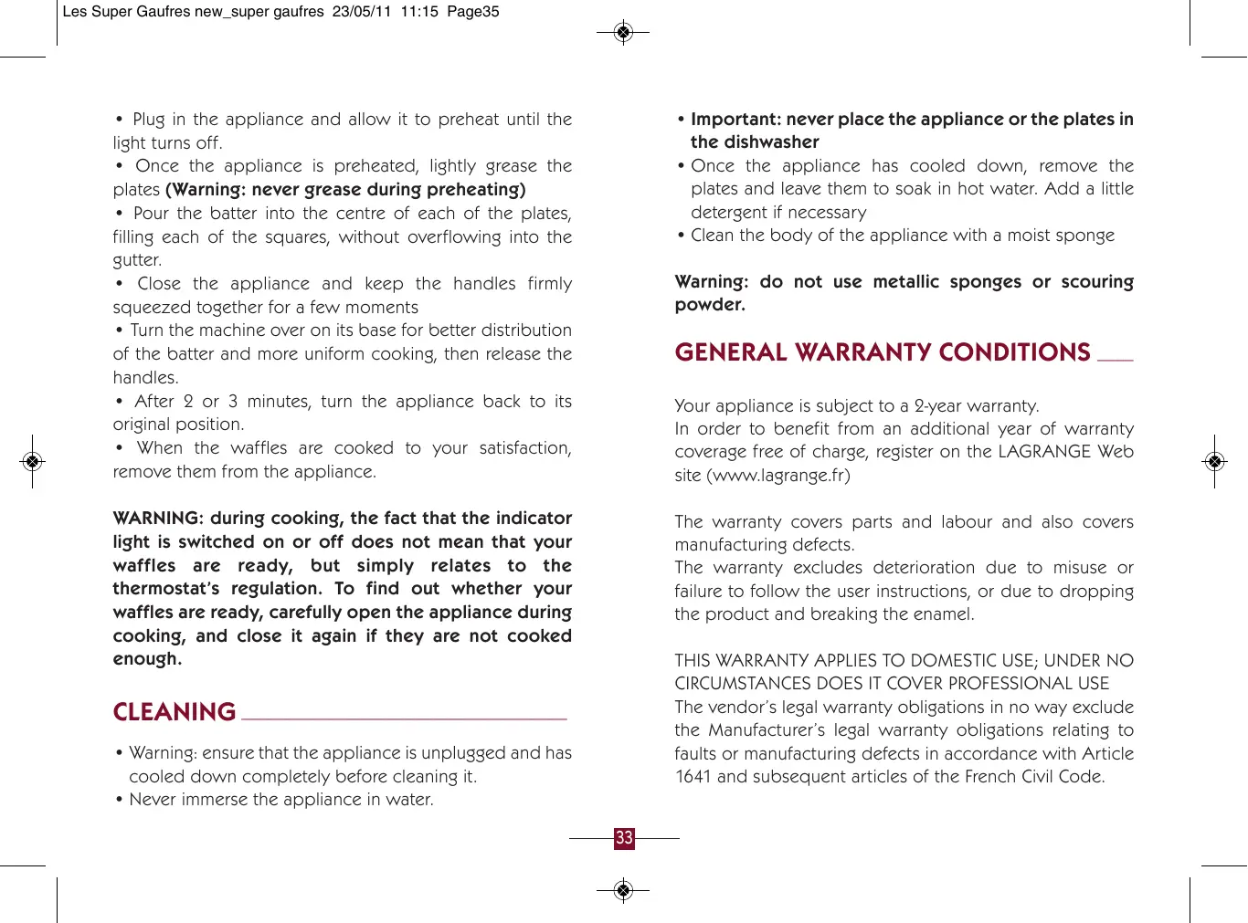 light is switched on or off does not mean that your waffles are ready, but simply relates to the thermostat’s regulation. To find out whether your waffles are ready, carefully open the appliance during cooking, and close it again if they are not cooked enough. The warranty covers parts and labour and also covers manufacturing defects. The warranty excludes deterioration due to misuse or failure to follow the user instructions, or due to dropping the product and breaking the enamel. THIS WARRANTY APPLIES TO DOMESTIC USE; UNDER NO