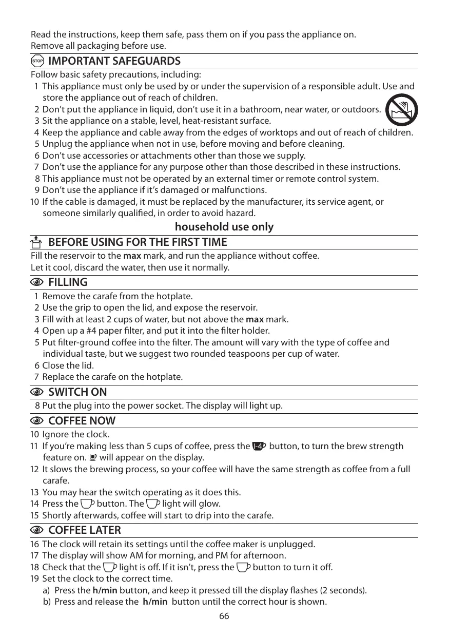 20 Set the timer to the time you want to start brewing. a) Press and release the T button. The display will show – : – – b) Press and release the h/min button until the correct hour is shown. c) Press and release the T button – the minutes side of the display will flash. d) Press and release the h/min button until the correct minute is shown. e) Leave the controls for 5 seconds to confirm the time. , If you don’t press the h/min button within 5 seconds, the display will revert to “normal”, and the time will show. Press the T button, and start again.